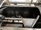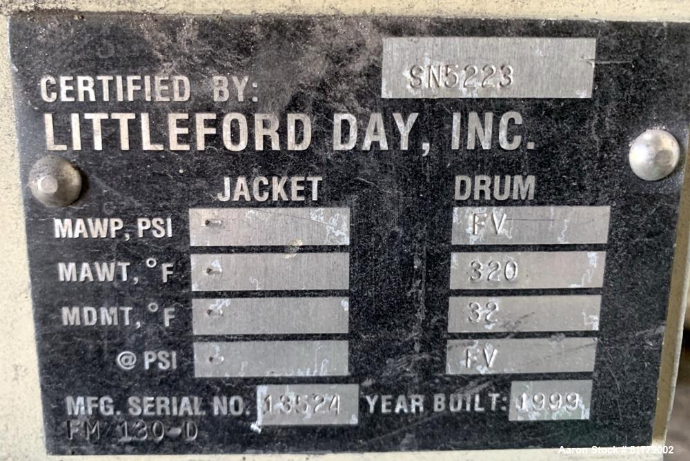 Used Littleford Batch Type Plow Mixer, Type FM-130-D, 130 Liter, 304 Stainless Steel. 3 Cubic feet working capacity, 4.6 total. Approximate jacketed chamber 20" diameter x 26" long. (2) Plows, (2) half plows, (2) end scrapers driven by a 10hp, 3/60/460 volt, 1770 rpm motor thru Falk drive, 8.908 to 1 ratio. Side entering chopper, 4-tier (4) blade, approximate 7" diameter driven by a 10hp, 3/60/460 volt, 3330 rpm motor. Chamber rated Full Vacuum at 32 to 320 Degrees F. Jacket rated 75 psi at 32 to 320 degrees F. XP Rated. Includes XP control panel. Openings top: 22" x 14" hinged clamp down cover with 8" inlet. Approximate 6-3/8" x 4-5/8" bottom outlet with manual valve. Mounted on frame. Serial# 42734-5223, National Board# SN5223, built 1999.