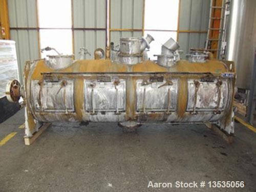 Used Lodige Type FKM 2000 DA4Z Horizontal Mixer with Stainless Steel Jacket. Total volume 528 gallons (2000 liters). Interior tank dimensions 37" x 116" (940 x 2950 mm). Outer dimensions 12' x 4' x 4.9 (3700 x 1200 x 1500 mm). 50 Hz.