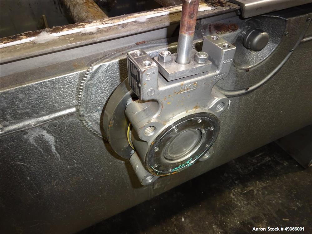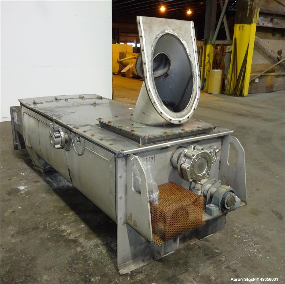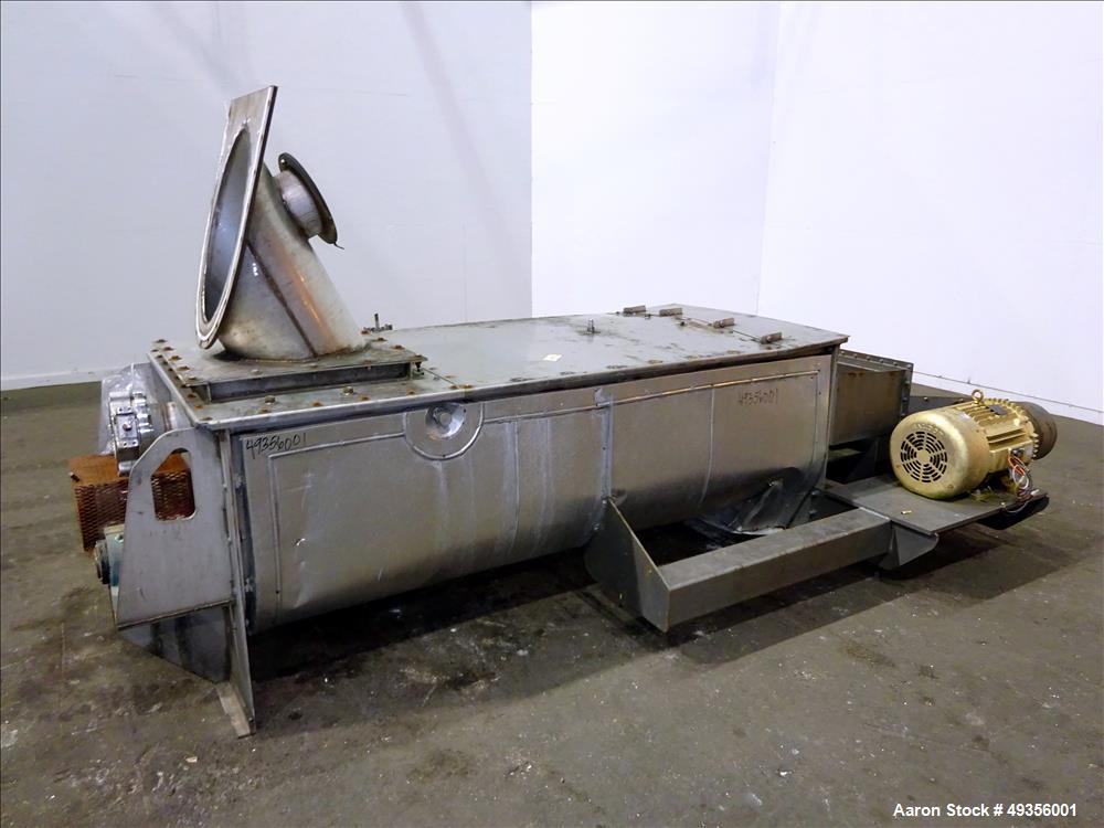 Used Hayes & Stolz Twin Shaft Continuous Pug Mixer, Model DA20-0609, 304 Stainless Steel. Chamber approximate 96" long x 41" wide x 22" deep. (2) 4-1/2" diameter shafts, each with (32) 5" wide x 3/8" thick bolt-on paddles. Driven by a 10 hp, 3/60/230/460 volt, 1770 rpm motor thru dodge reducer with 9.183:1 ratio. Approximate 32" x 10" bottom outlet. 3 Bolt-on top sections, (1) 18" x 16" top hopper. Liquid addition bar. Serial# 1865103.