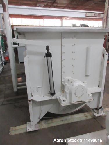 Used 150 Cubic Foot Stainless Steel Ribbon Blender. 1/2" ribbon thickness, 40 hp ac motor (230/460) with heavy duty gearbox, chain driven, 48" ribbon diameter, 9" diameter center dump with pneumatic slide gate, pneumatic lid assist, motor starter with control box. Comes with leg extensions.