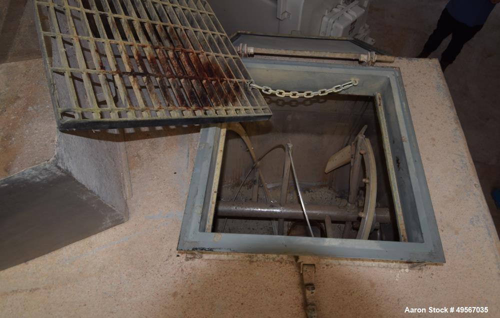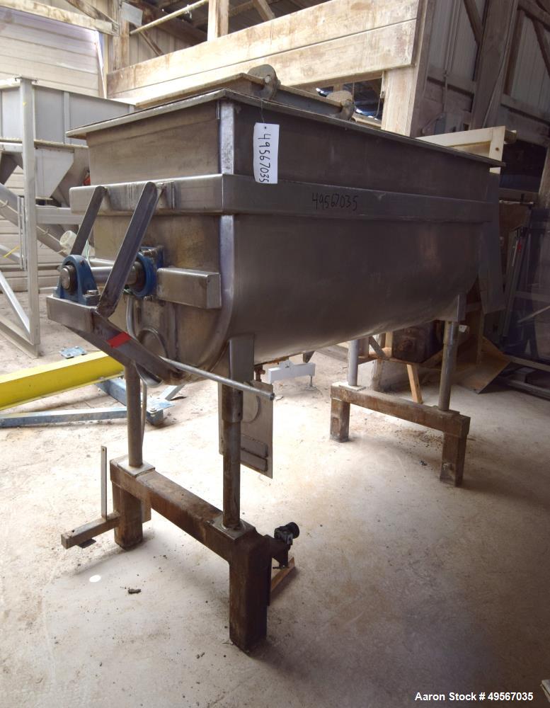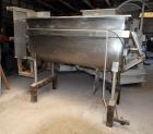Used Double Spiral Ribbon Blender, Approximately 37 Cubic Feet, Stainless Steel. Non-jacketed trough 32" wide x 72" long x approximate 35" deep. Approximate 2-1/2" diameter bolted shaft. Inner & outer ribbons 1-1/2" wide x 1/4 thick, welded to 1" diameter posts. Top cover, outboard roller bearings. Requires a motor. Approximate 8" end bottom outlet. Mounted on 4 stainless steel legs with carbon steel extensions.