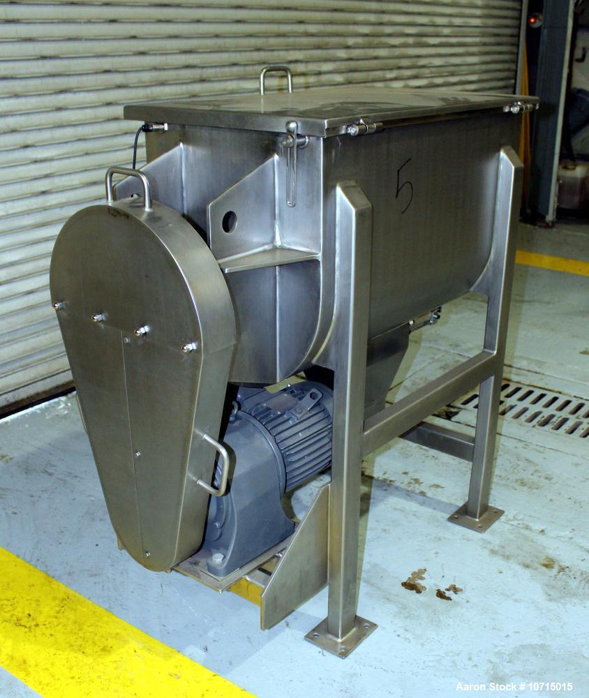New- Paul O. Abbe Model IMB-5, 5 Cubic Foot Working Capacity Ribbon Blender. 304 Stainless Steel, Polished Finish Interior and Exterior. Inside Trough Measures 18" Wide x 32" Long x 22" Deep. 3.5" Center Bottom Outlet with Air-Operated Slide Gate Valve. Top Cover with Safety Grate. All external stiffeners, legs, ribs and supports are constructed of 304 Stainless Steel. Double Spiral Ribbon Design Agitator, 304 SS Construction. 2.25" Diameter Removable Main Shaft. 3 HP 3/60/230-460 volt, TEFC Motor. Chain and Sprocket Driven with 304 Stainless Steel Chain Guard. Allow approximately a 4 Month Delivery from receipt of purchase order, 30% deposit and signed approval drawing & application form. 1 Year Warranty.