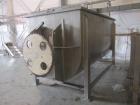 Used 300 Cubic Foot Aaron Process Ribbon Blender, Model IMB300. Sanitary stainless steel construction. Approximately 67" wide x 132" long trough, double ribbon, outboard roller bearings, chain and sprocket driven with 60 hp motor drive. Center bottom outlet with full covers, on stainless steel stands.
