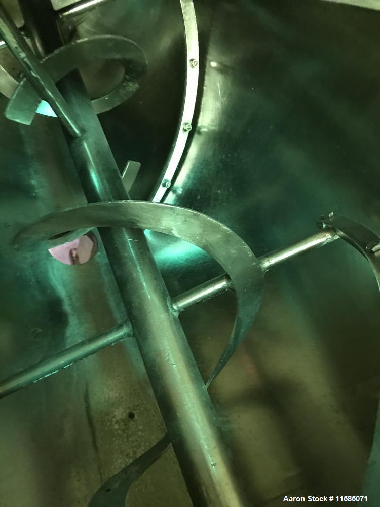 Used-JH Day 5 Cubic Foot (approximately) Stainless Steel Double Ribbon Blender. Approximately 16" wide X 38" long X 19" deep. Center bottom discharge. Approximately 1.5 hp Motor and reducer. Top hinged cover. Mounted on legs.