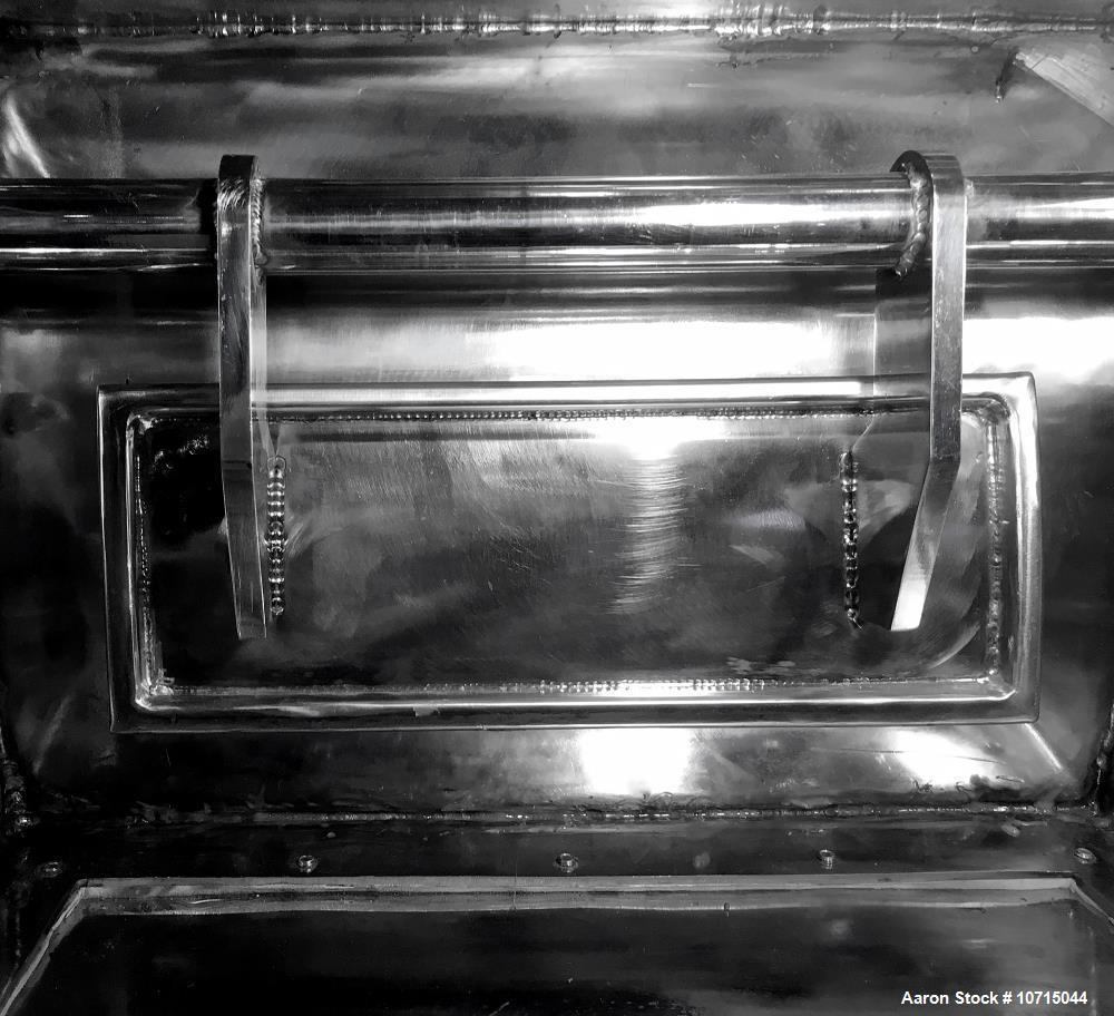 New- Paul O. Abbe, Model RB-195 Ribbon Blender. 195 Cubic Foot working capacity. 220 Cubic Foot total volume. Type 304 stainless steel polished. Food grade. All stainless steel construction. Trough dimensions: Approximately 56.7" wide x 118.2" long x 62.6" deep. Internal double spiral ribbon. Packing glands and pillow block bearings. 50 hp SEW Euro drive hollow bore design. 230/460 volt, 1775 rpm, 3/60 with approximately output 26 rpm. Top cover with hold down clamps and limit switch. Center Loading cover with welded safety grate, 30" wide x 50" long. Approximate 4.7" wide x 19.7" flush air operated plug valve. Discharge housing is approximate 20.5" wide x 28.4" long. Approximately 4" discharge height. Approximate weight 11,660 pounds. Approximate overall dimensions: 76.4" wide x 183" long x 93.8" high. IN-STOCK and READY FOR IMMEDIATE SHIPMENT. 1 YEAR WARRANTY.
