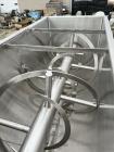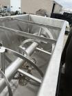 Used 316 Stainless Steel Double Spiral Ribbon Blender. Approximate 270 Cubic Foot working capacity. Non-Jacketed trough approximately 144" L x 60" W x 66" Deep. Open top, no cover. Approximate 10" diameter shaft, 1/2" thick x 3" wide outer ribbon, welded to 3-1/2" diameter posts, 7/16" thick x 3" wide inner ribbon welded to 3-1/2" diameter posts. Driven by a 75hp 3/60/230/460 volt, 1770rpm motor. Approximate 20" long x 12" wide center bottom discharge. Mounted on (4) stainless steel legs. 40" discharge height. Missing discharge cover, pneumatics, chain, gearbox, guarding.