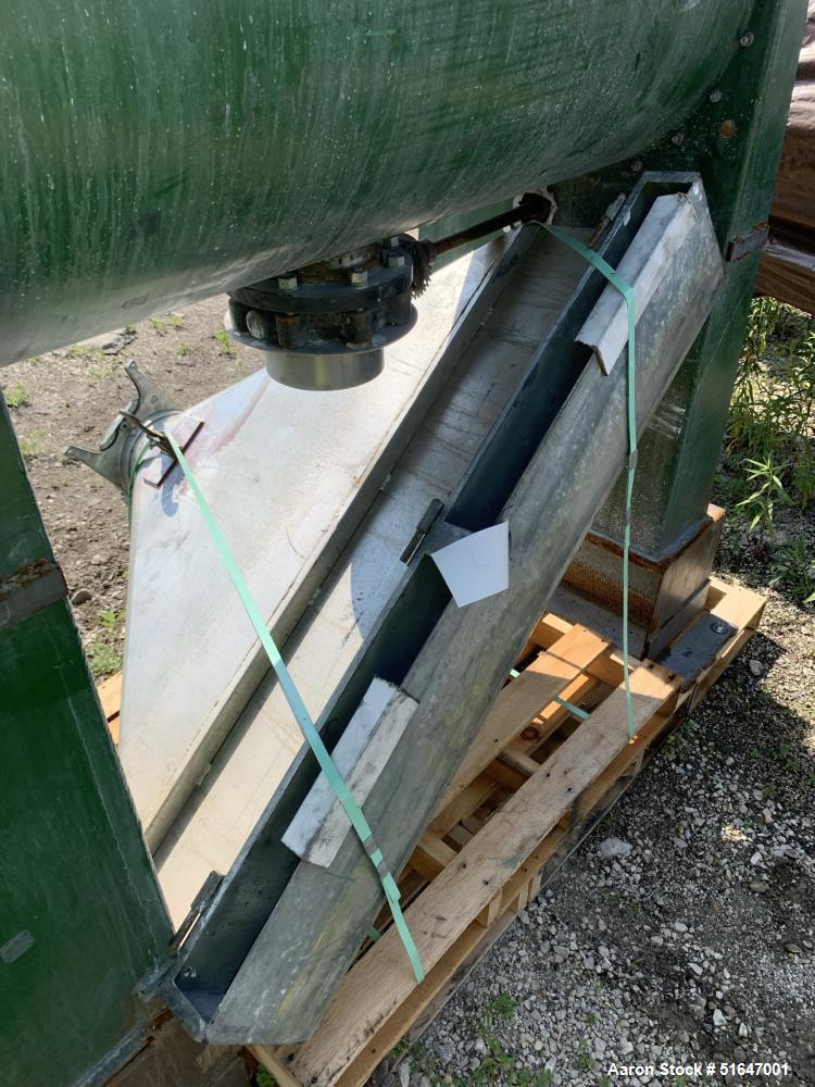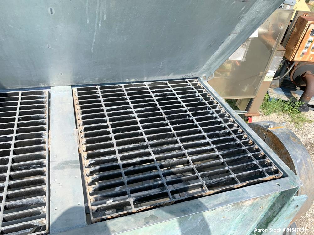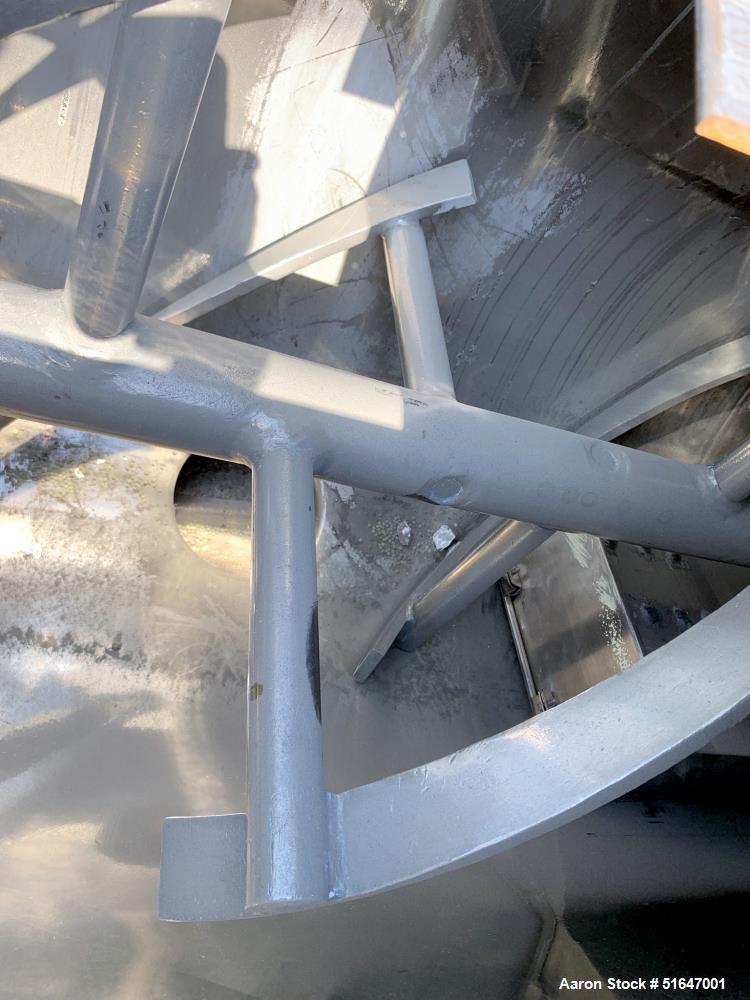 Used Toronto Coppersmithing Single Spiral Ribbon Blender. Approximately 14 cubic foot capacity. 304 Stainless Steel Contact Areas. Non-jacketed trough approximately 48" Long x 24" Wide x 28" Deep. Single interrupted spiral ribbon with approximate 3" diameter shaft, 1-1/2" diameter welded post with 2" wide ribbons. Driven by a 10hp, 3/60/230/460 volt, 1760 rpm motor. Center bottom outlet approximately 6" diameter with manual butterfly valve. Includes top hinged cover with (2) safety grates. Mounted on a painted carbon steel frame. Serial# 4793.