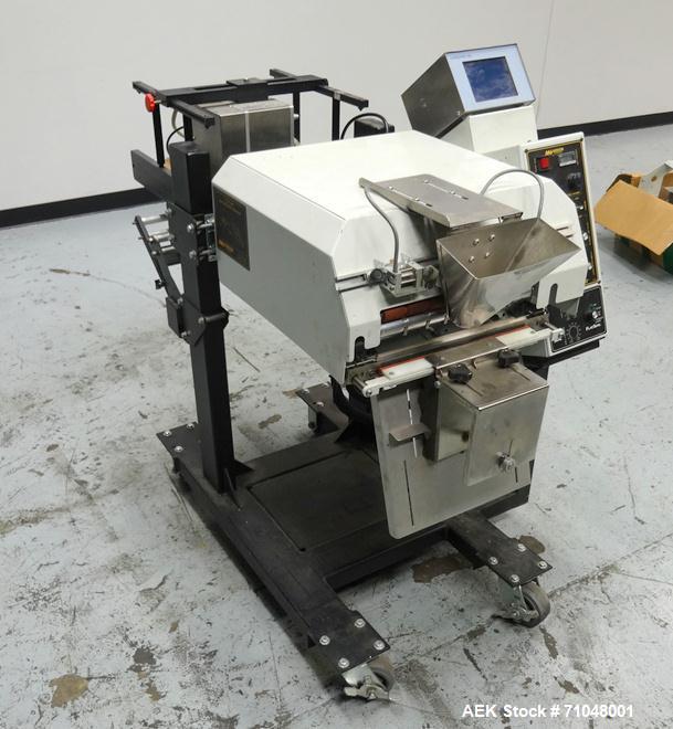 Used Audion Automation Model Titan 6500 Rollbag Automatic Bagger and Sealer. Machine is capable of speeds up to 60 pre-formed bags per minute. Bag size range: (width) 2" - 12", (length) 2" - 22". Seal length x width: 12" x 1/8" or 35cm x 0.3cm. Includes fully programmable thermal graphics printer for printing text or graphics such as UPC codes, logos, and other images and is integrated on this machine.