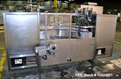 Used Bevco Model M150R Ionized Air Bottle Rinser. Machine can operate at speeds of up to 150 bottle per minute. Is a 2 speed function machine. Has vacuum manifold. Machine uses ionized air. 3/60/460V. Built 2003. Machine footprint 102" long x 48" wide x 67" tall.