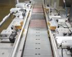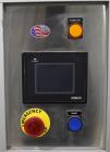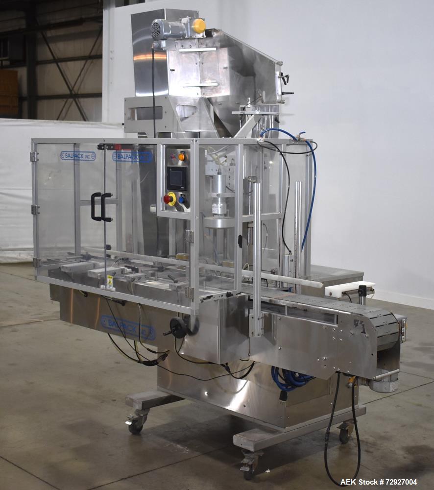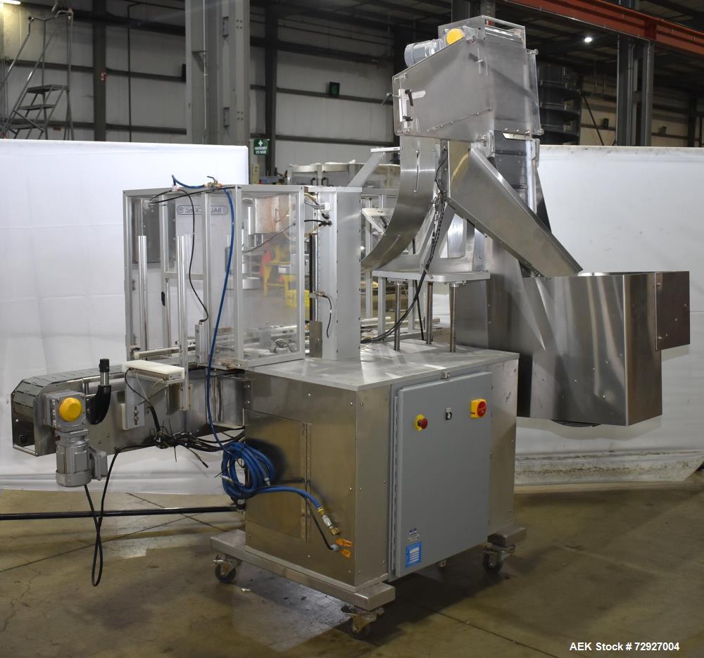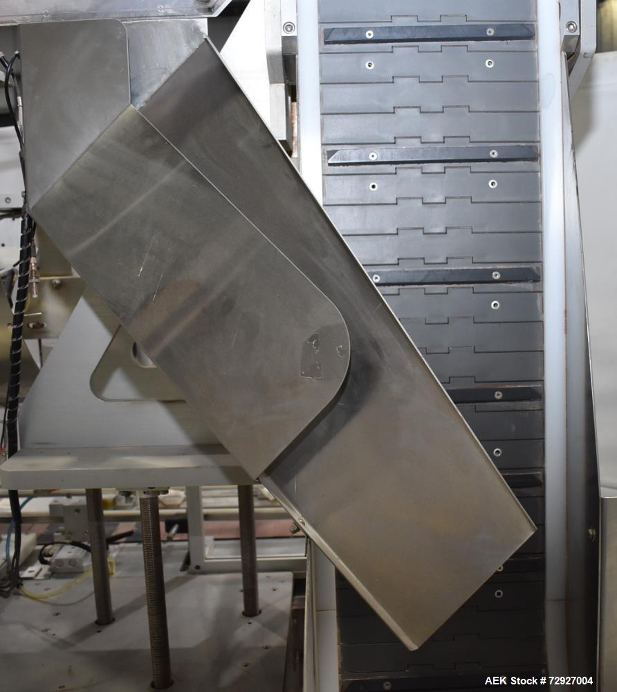 Used Balpack Automatic 2-Station Chuck Capper, Model CEIB. Fully Automatic 2 station inline chuck capper. Capable of speeds up to 55 BPM. Large format cap size range: 45mm-120mm (dia) with changeparts. Currently set up for 120mm dia caps. Has cleated belt elevator to cap chute feed system. Double gripper container handling. Large capacity cap sorting elevators with 12" wide chain. Air controlled 1st station cap placing system with integrated vacuum pick up for holding cap while placing on container. Air controlled 2nd station torquing chuck, for highly accurate and repeatable final torque. Omron HMI.