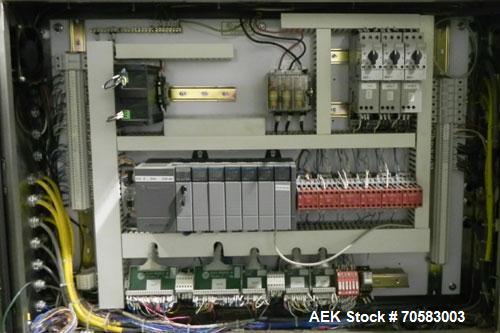 Used MGS Model RCS-150 Automatic Horizontal Cartoner capable of speeds up to 60 cartons per minute. Intermittent motion machine. Has 12" centers for a carton size range: Length 1 to 6.5", width 0.5" to 3.5", depth 3" to 6.5". Designed for hot melt glue closures, includes Nordson hoses and guns, does not include glue pump unit. Has Allen Bradley SLC 5/04 PLC with a PanelView 1000 touch screen. Machine has an embosse date coder. Has an Argus Laetus bar code reader. Includes an MGS three-fold leaflet inserter. Has a 10' long 6 bucket infeed with single station product loader. Has all stainless steel guarding and Lexan enclosure. 3/60/460V. Built 2003.