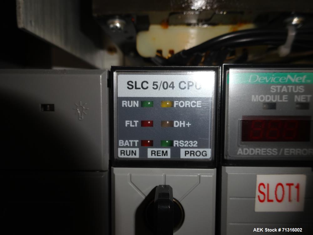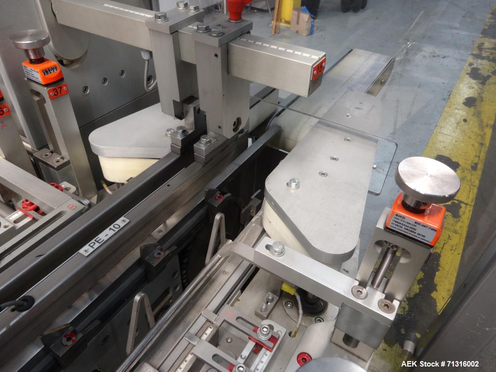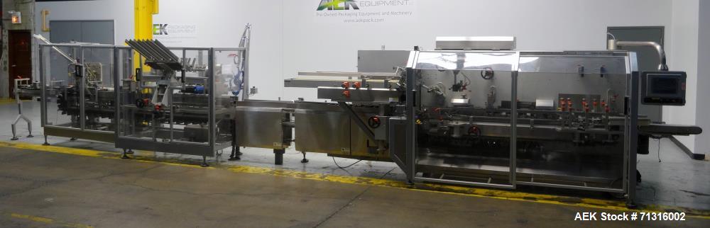 Used Serpa Model P100 Balcony-Style Automatic Horizontal Tuck Cartoner bottle load cartoner with leaflet feeder. Machine is capable of speeds from 36 to 120 cartons per minute. Has a carton size range of: 3/4" to 4" (length); 1/2" to 3" (width); and 2-1/2" to 7" (depth). Has timing screw bottle infeed with automatic barrel cam carton loader. Has an adjustable bucket infeed conveyor, emboss date coder, bar-code scanner, and a rotary carton feeder. Also includes a GUK PA 21/2 pre-folded leaflet feeder. Uses an Allen Bradley (AB) SLC 5/04 PLC and has an AB PanelView Plus 100 HMI operator panel. Unit was last used in a nutritional solid dose packaging operation. 3/60/575V.