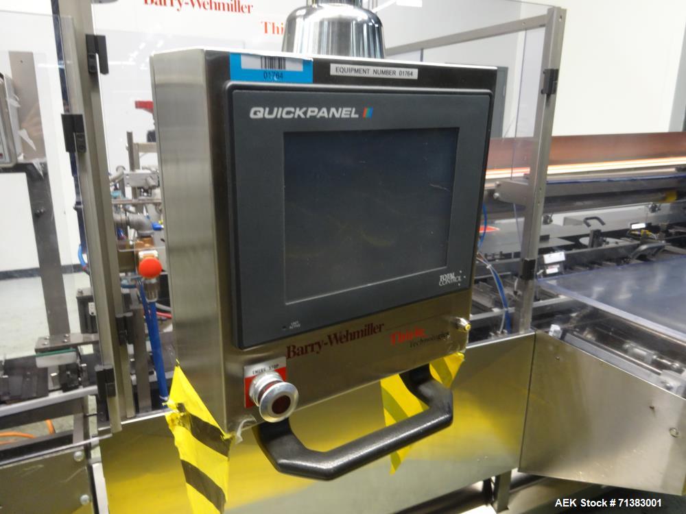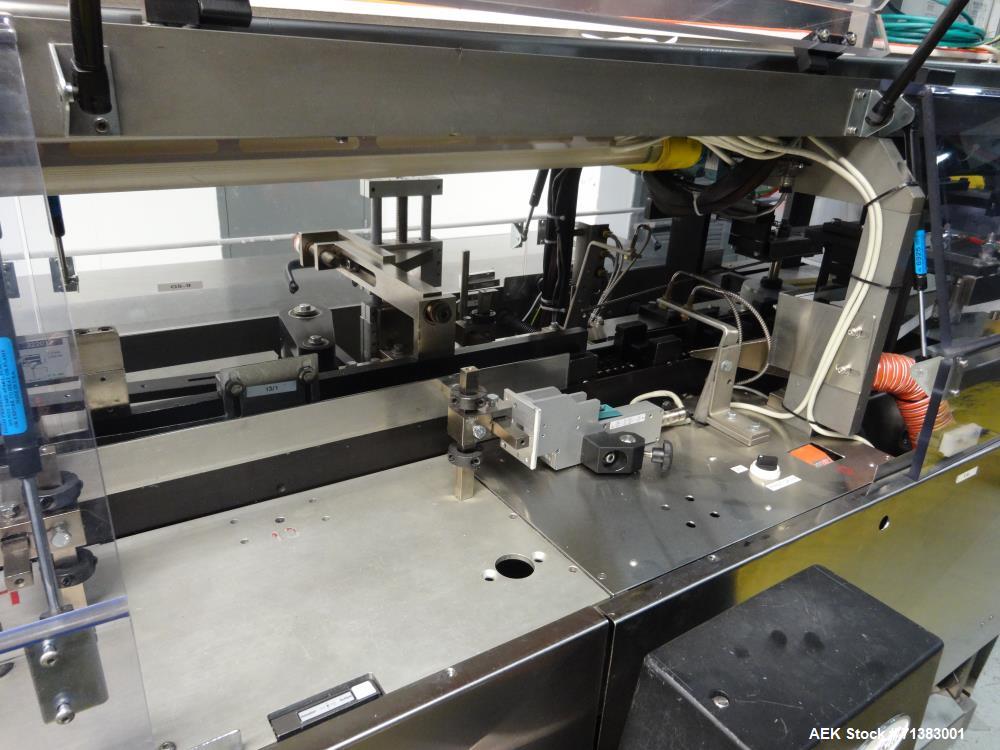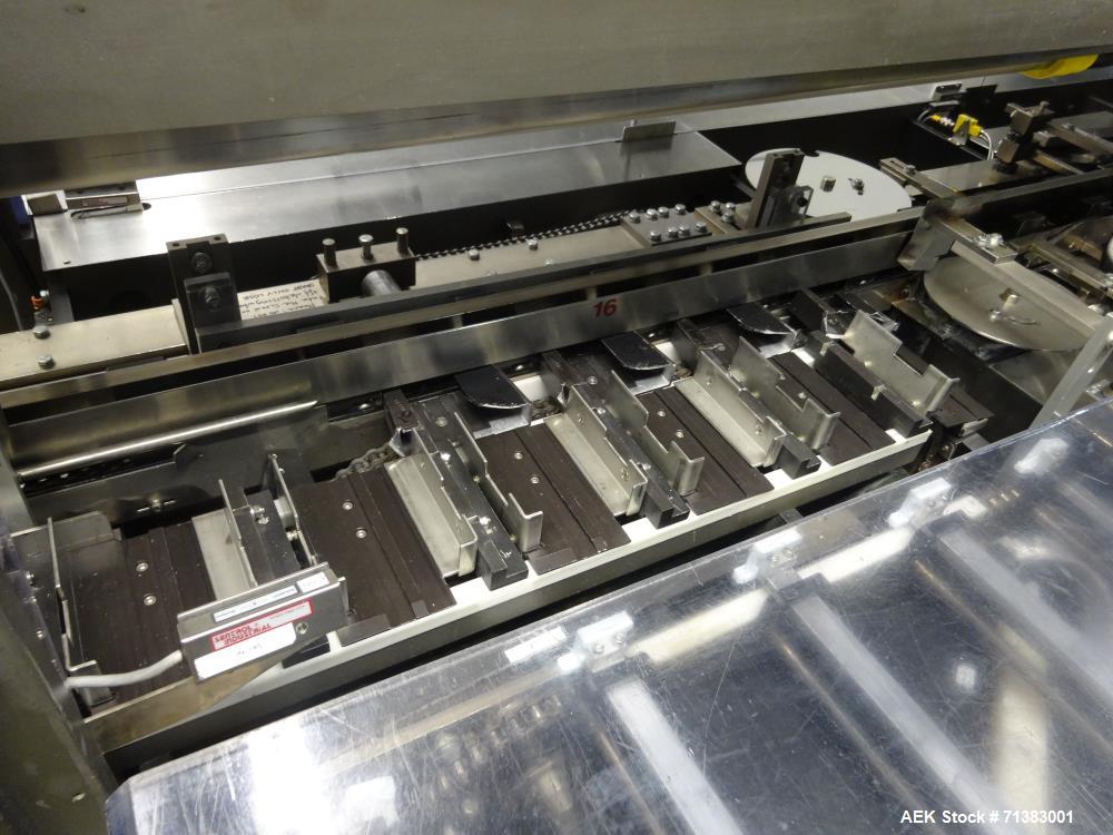 Used Thiele Servostar 160 Automatic Horizontal Hot Melt Glue Cartoner. Capable of speeds over 175 cartons per minute. Has 6 1/4" centers, with carton size range of 3/4" to 5" length, 1/2" to 3-1/4" width, and 4-1/2" to 8" depth. Has adjustable bucket infeed, equipped with 5 Thiele feeders; 3 feeders for product pouches, and 2 for instructional leaflets. Includes Laetus barcode scanners, embosse date coder and Nordson 3100 hot melt glue system. Has Allen Bradley SLC500 PLC controls with servo controllers. PLC upgrades, retooling and set to size for your application available upon request. Ask your AEK sales specialist for details. Pricing and lead times to be quoted per application upon receipt of carton and product samples. 3/60/460V, 60hz.