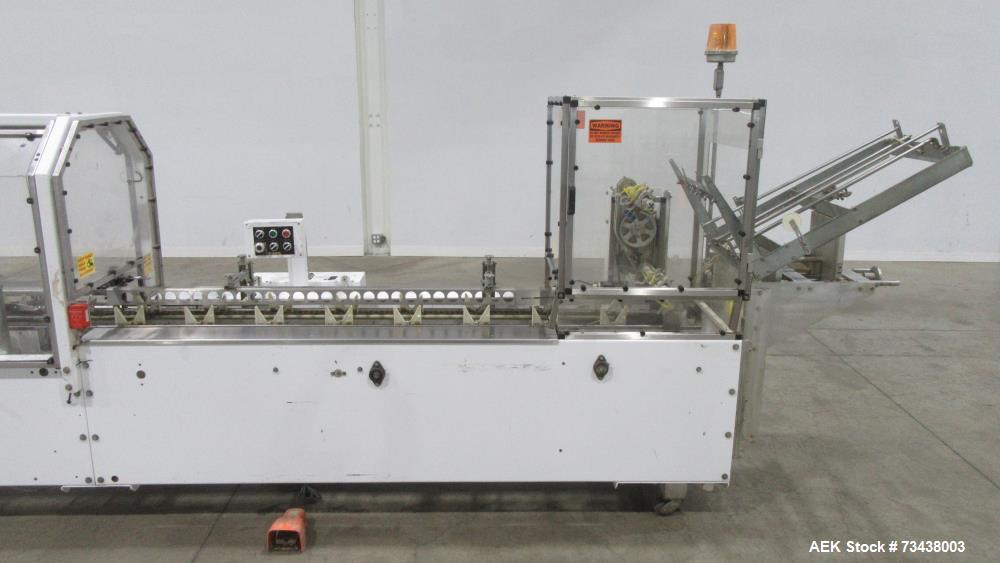 Used Adco Horizontal Manual Load Cartoner, Model 15D105-EC. Approximate 125 cartons/min speed range with adjustable centers. Carton size range 1 to 9-1/2" length x 3/4" to 3" wide x 5" to 12" depth. 12" Centers. 7-1/2" set up. 9-5/8" Wide conveyor. Has 6' manual load area. 36" Inclined gravity fed carton hopper. Glue closure with Nordson MicroSet Hot Melt Glue unit. 3/60/230 Volt, 25 Amp.