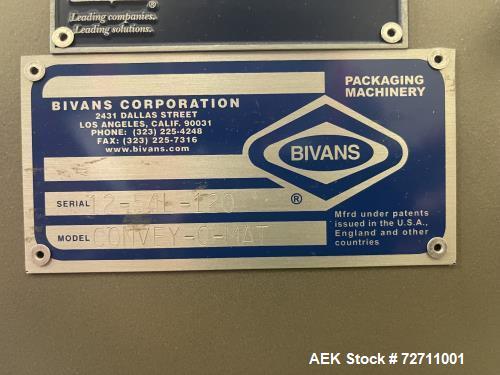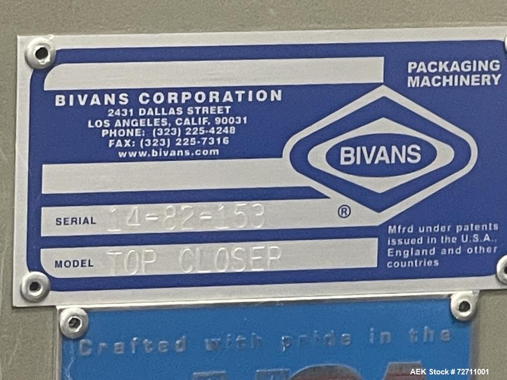 Used Bivans 54L Carton Former with Bivans Model 82 Top Closer. Capable of speeds up to 60 cartons per minute. Has a carton size range: (Length) 1/2" - 8-7/8", (Width) 3/8" - 7", (Depth) 1-1/8" - 14-1/16". Set up for tuck sytle cartons. Includes Lexan safety guarding and is mounted on casters. 110V/1Ph/60Hz, 100 psi air. Bivans Model 82 Top Closer. Capable of speeds up to 60 cartons per minute. Has a carton size range: (Length) 7/8" to 5 1/4", (Width) 1/2" - 3", (Depth/Height) 2-1/4" to 12". Currently set up for straight tuck closures.