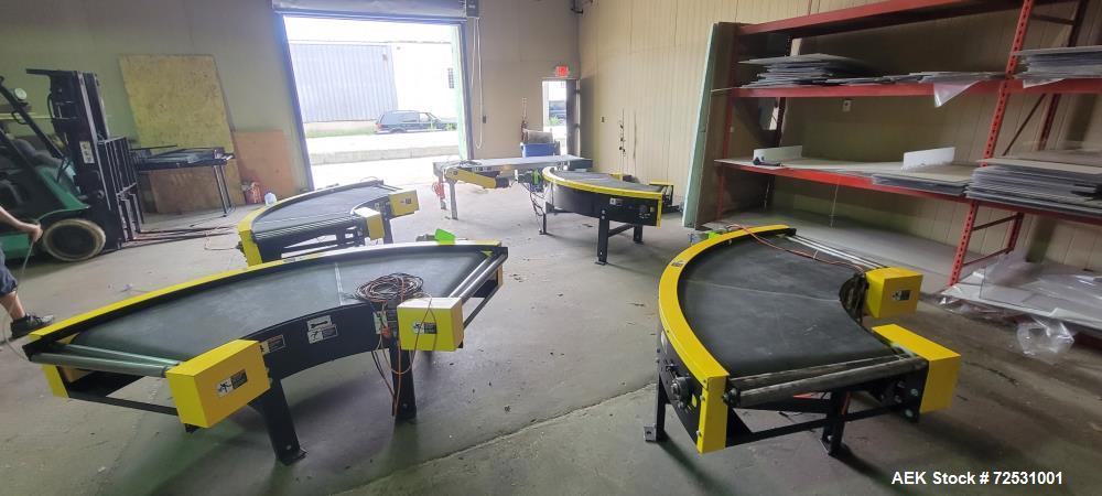 Used Omni Metalcraft 90 Degree Turn Belt Conveyor. Includes (4) pieces. Has 27" wide belt, 90 VDC drive controlled with 110 VAC variable speed drives. Mounted on adjustable legs.