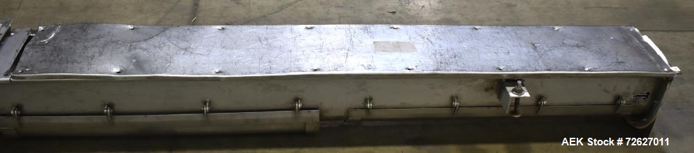 Used Screw Conveyor, 304 Stainless Steel. Approximate trough 110" long x 10-1/2" wide x 10-1/2" deep. Top infeed 10" x 10", 6" bottom discharge. Screw approximately 8-1/2" diameter x 110" long. Driven by 1.5hp, 3/60/230/460 volt, 1755 rpm motor, with Dodge speed reducer, 25.64 to 1 ratio. Bolt-on top cover, (2) hinged bottom covers. 3/60/230 Volt.