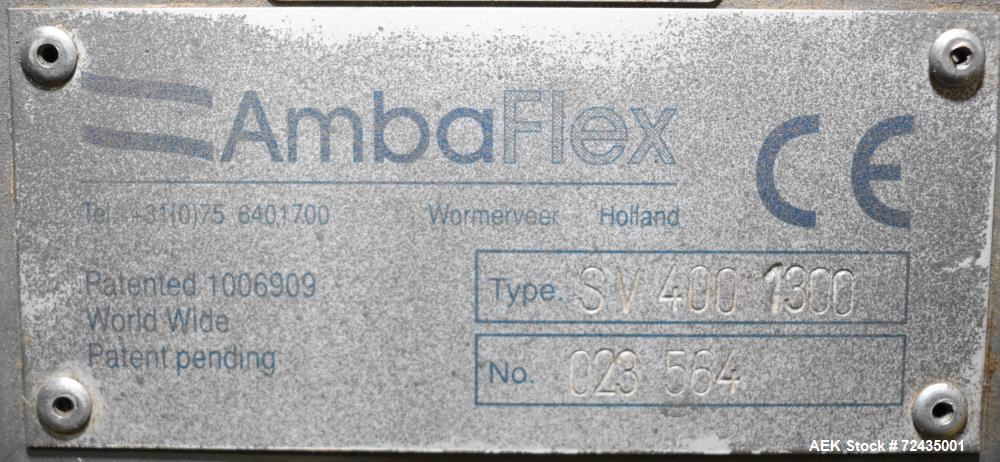 Used Ambaflex Model SV400-1300 Spiral Case Conveyor. Single belt, 16" (400mm) wide. Approximately 17' tall. (6) 360 Degree turns. G configuration. Approximate 5'-7" square footprint. Last used in Nutritional drink filling operation. Serial# 023 564. Feeds product from bottom to top.