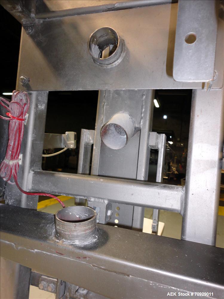 Used Chantland 4210 Air Valve Bag Packer capable of speeds up to (8) 50 lb bags per minute. Weight ranges: 25 lb to 110 lb bags. Includes bag conveyor. Has Rice Lake load cell with preset digital controller and Chantland 46903 HMI. Has 12" diameter top opening with pneumatic butterfly valve, 13-1/4" diameter hinged bottom door, and 3" diameter discharge opening. Last used in pharmaceutical packaging operation. Air requirements: 12 cfm at 80 psi maximum.