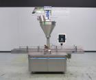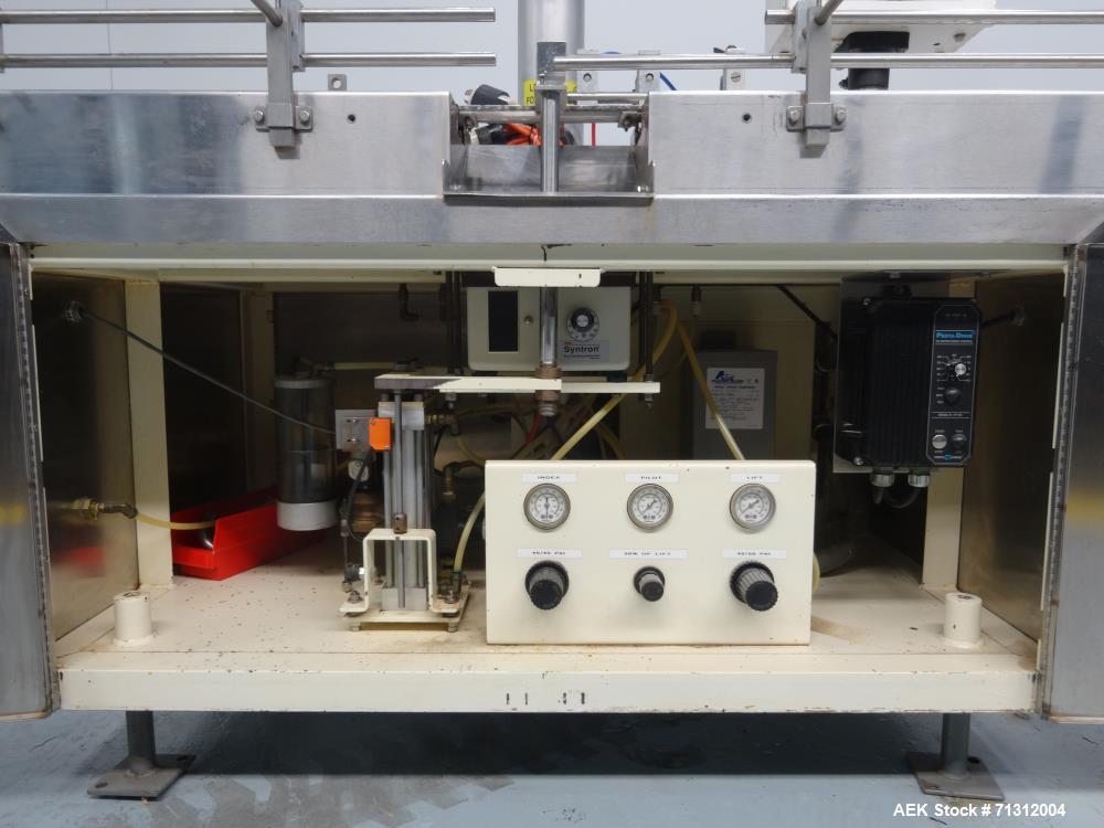 Used Mateer-Burt (Pneumatic Scale) Model 3930 "Neotron System" Powder Auger Filler. Machine is capable of 90 containers per minute (depending on container size and product). Unit has a 94" (long) by 4-1/2" (wide) table top chain conveyor with guide rails and variable speed drive. Bottom up fill, auxillary agitations. Includes an FMC Syntron vibratory product settling device. 3/60/220V.