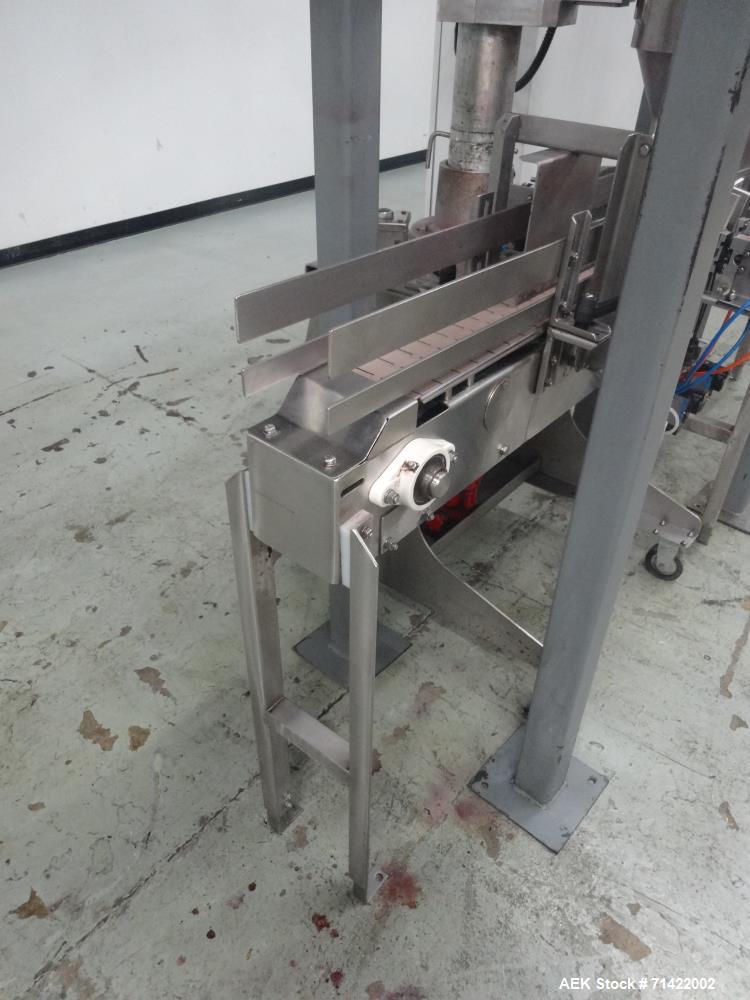 Used Nalbach Powder Auger Filler. Model NAF-1000-D. Servo Powder Auger Filler with pneumatic conveying product feeder, pneumatic container indexing, tooling with 1:4 splitter funnel and a 104" long x 4.3" wide conveyor section. Last filling bakery nonpariels into spice jar type containers.