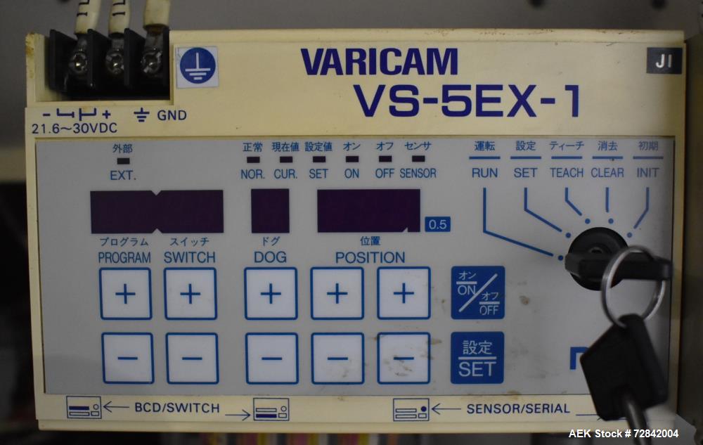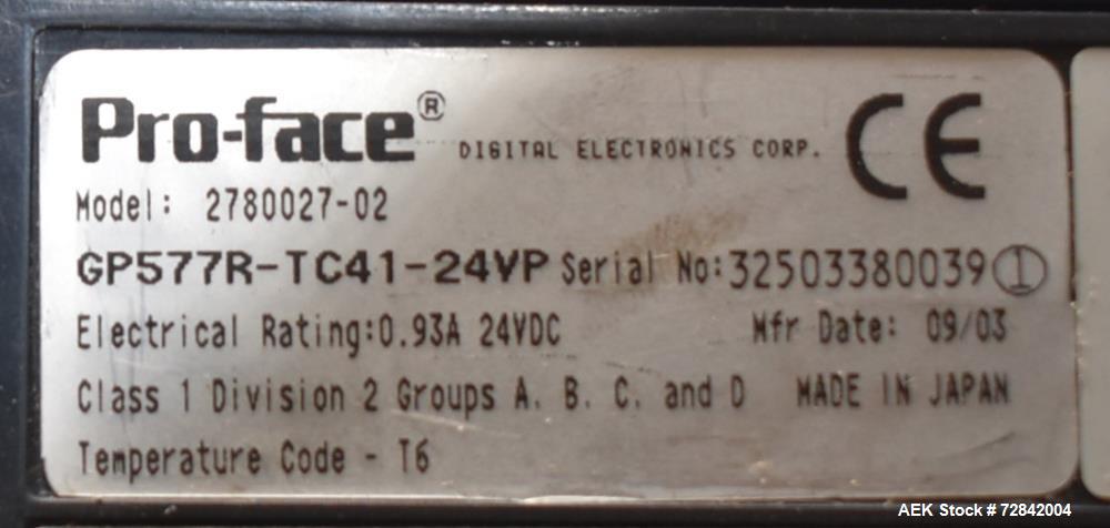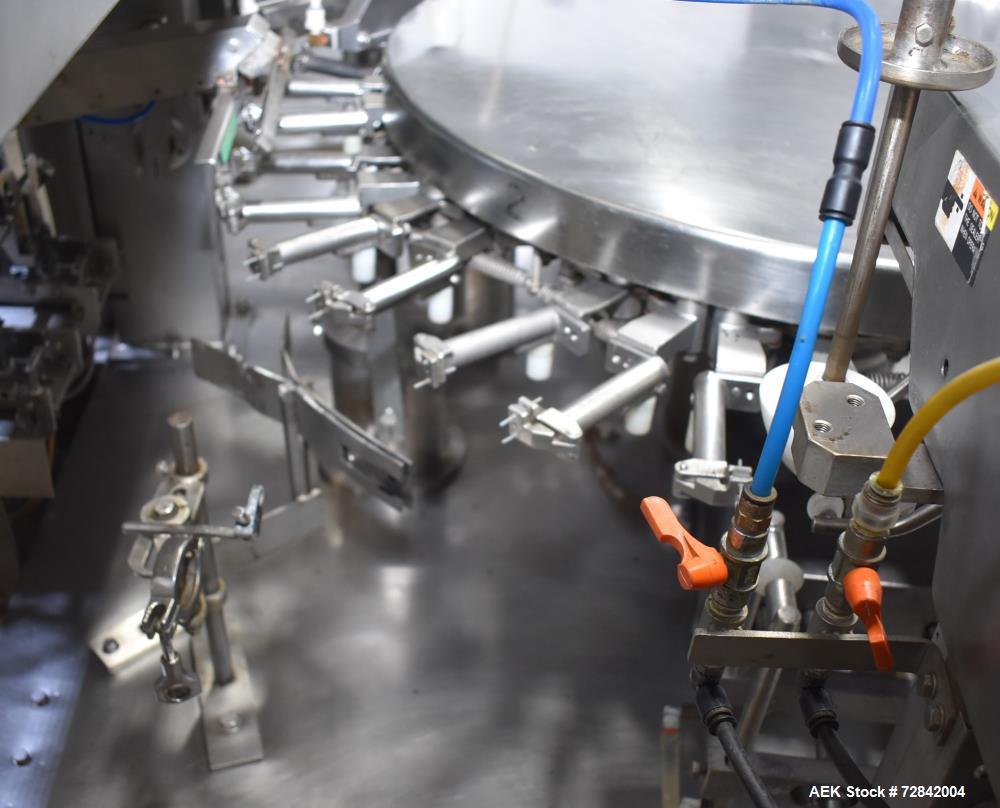 Used Toyo Jidoki Horizontal Pre-Made Pouch Packager, Model TT9CW. Machine rated for speeds up to 100 packages per minute. Has a size range of 80mm to 150mm (width) and 120mm to 230mm (length). Filling range: standard 50 - 350CC. Proface HMI, Allen Bradley SLC 5/04 PLC, Frenic-Multi drive. Dual lane pouch infeed, approximately 6" wide x 36" long. (6) Seal bars, approximately 6-1/4" wide. Liquid tank skid with control panel. 3/60/480V.
