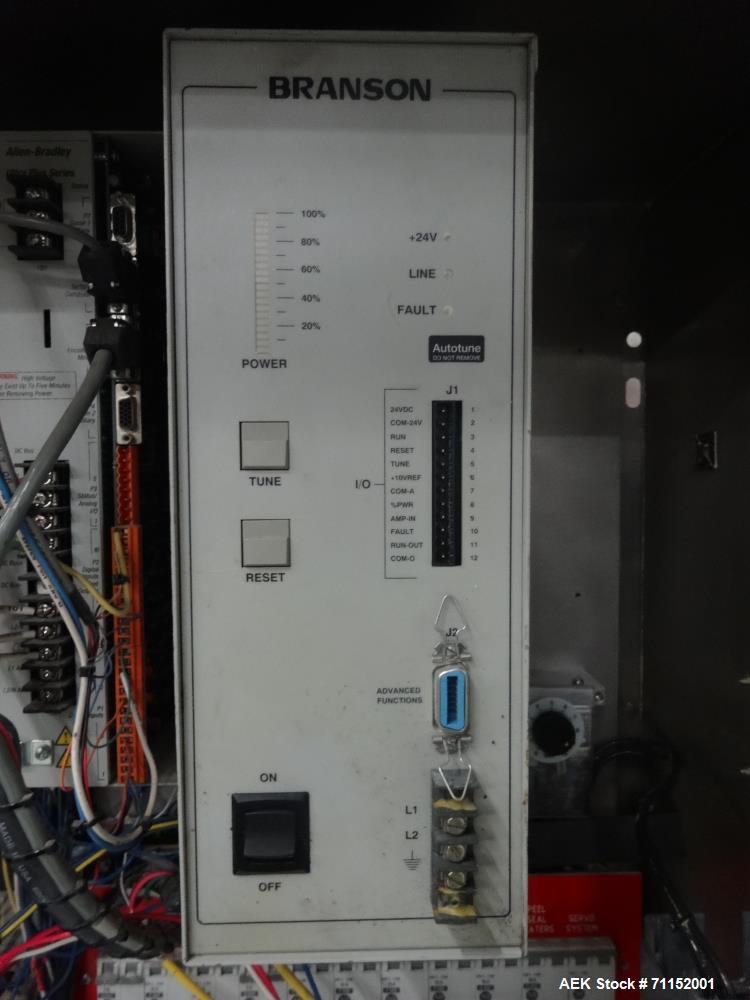 Used Pacmac Model 9500 Vertical Form Fill and Seal Machine. Has a bag size range of: 3" to 15" (wide) and 4" to 19" (length), is currently fitted with a 7-1/4" (wide) x 5" (deep) oblong forming horn. Machine has maximum web width of 36". Uses PacMac PLC controls. Wash-down capable unit. Equipped with: Zipper Slider Bowl Feeder and Zipper Spool; Set up for Nitrogen Gas Flush; Bronson Ultra Sonic Sealer; Film registration; Product settling/shaker. Utilizes High Density Polyethylene(HDPE) film. 3/60/220V.