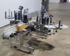 Used Quadrel Model Econoline Stepper Front & Back Automatic Labeling System. Capable of speeds up to 150 containers per minute (depending on application. Has a label size range: up to 6-7/8" (high). Has 12"L wrap belt, Top hold down belt with adjustment from 0 -15". Chain o liner container spacing. 7" Q110 LH Labeling head, stepper drive, std rewind, std peel plate. 7" Q120 RH Labeling head, stepper drive, std rewind, std peel plate, printer mounting kit, videojet 6230, 32mm LH printer. Has 16" Label Roll Unwind Capacity. 4-1/2"W x 120"L conveyor. Top hold down. Includes Video Jet 6230 Thermal Printer. Control panel with Control Techniques Commander C200 drives. Built 2021.