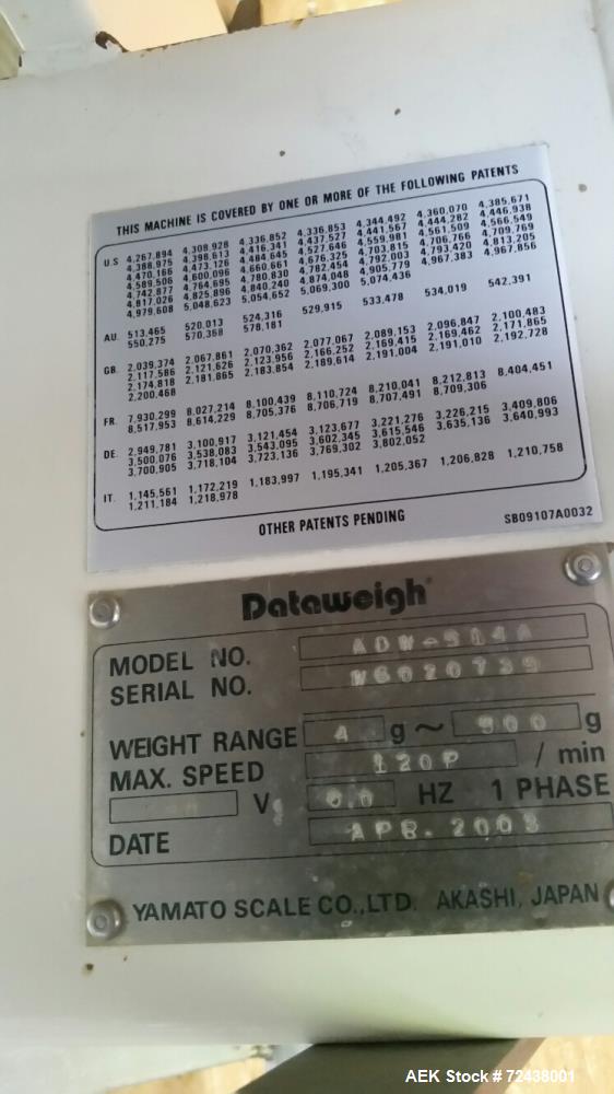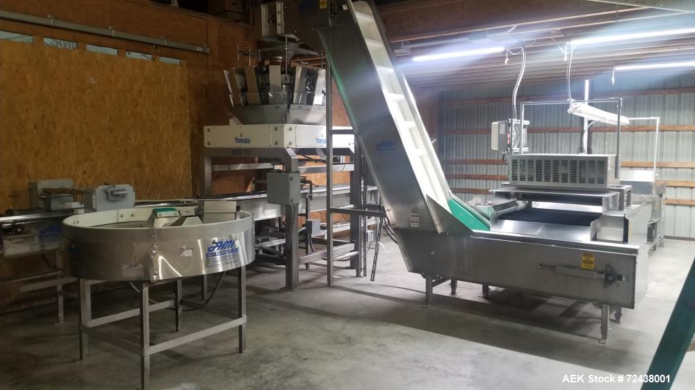 Used Yamato Model ADW-514A Combination Packaging Scale and Clamshell Indexing and System. Yamato scale is a 14 head radial combination system capable of cycling up to 120 CPM (depending on weight, application and product). Has 5 liter smooth buckets with a weight range of 4 - 300 grams. Serial # W6020735. Includes inclined cleated belt conveyor into scale. Also includes clamshell indexing conveyor system. Clamshells would be manually placed into a lugged chain conveyor, indexed under scale for filling, transferred into a lid closing station. The Produce feeding section and rotary accumulation table shown in the photo are not included. System was last running produce in clamshell containers. Sale includes dismantling and loading on truck.