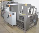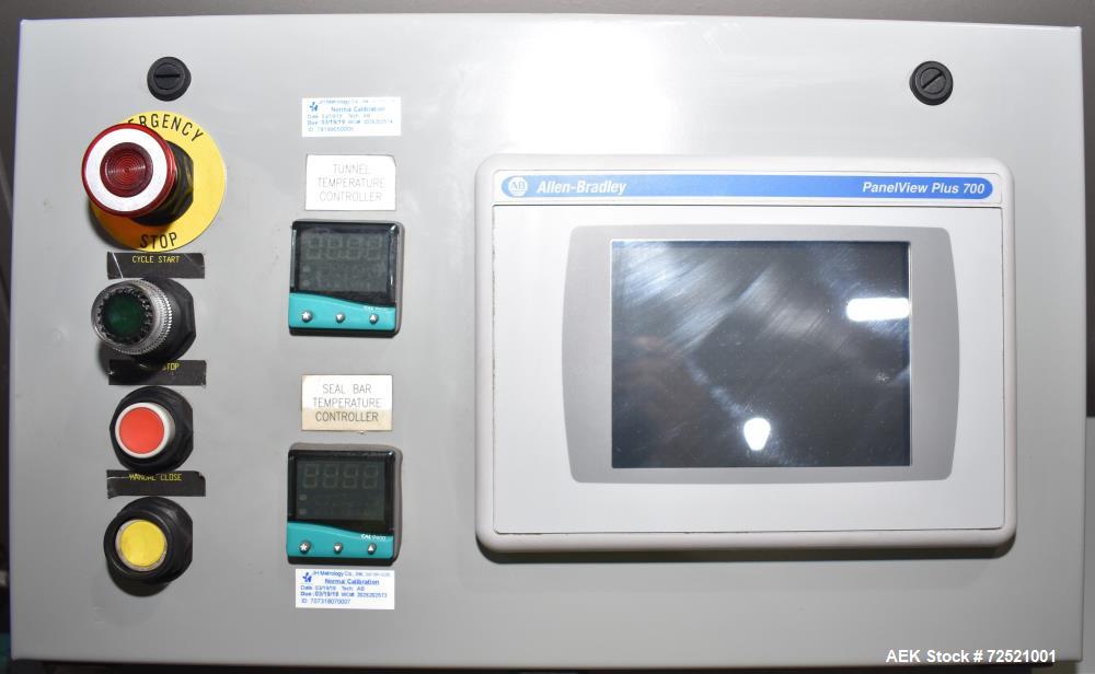 Used American Packaging Machinery (APM) Model MIC-26 Inline Shrink Bundler with Shrink Tunnel. Capable of production speeds up to 30 per minute. Straight infeed. Approximate 1/2" wide x 27" long seal bar with knife cutoff. Shrink tunnel approximate 20" wide x 17" tall with wire belt. Control panel with Allen Bradley L32E PLC, A/B Panelview Plus 700 HMI, (2) A/B Powerflex 4. 3/60/480 Volt, 46.25 Amp.