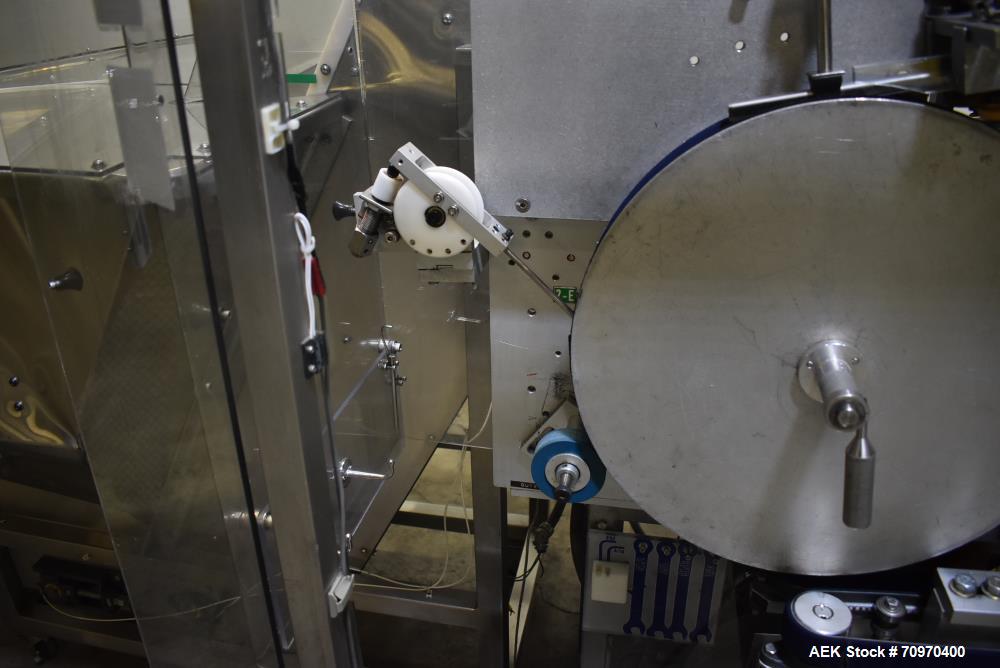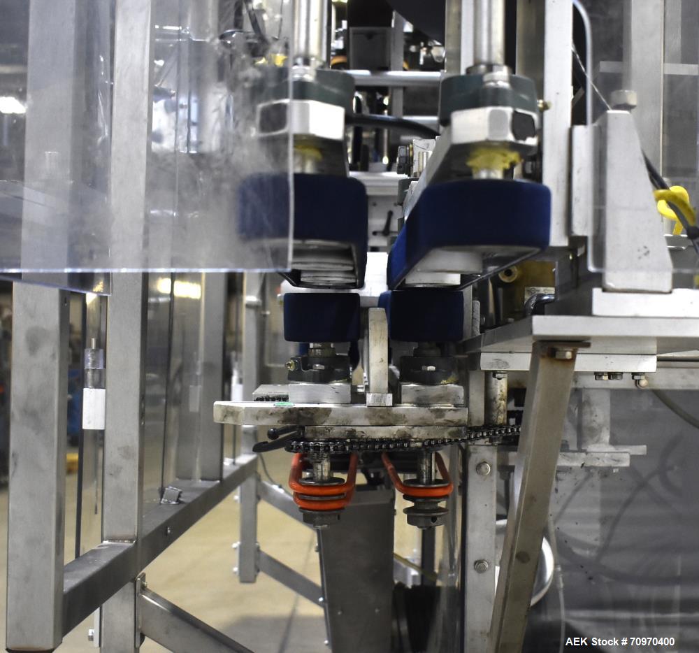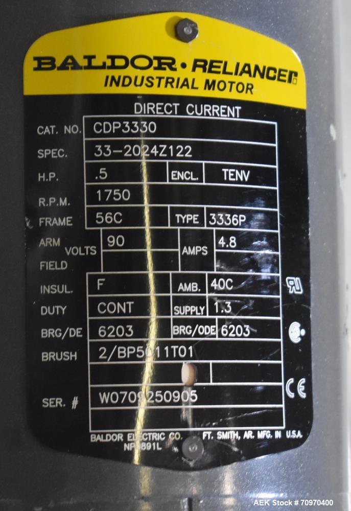 Used New England Machinery Model NEHCL-200AJ Bulk Bottle Unscrambler. Machine is capable of speeds up to 200 bottles per minute. Container size range: Diameter 5/8" - 3-1/2"; Height up to 10". Has integrated H/E-40 80" x 40" bulk bottle elevator with 8" wide x 2" deep angled cleats. Last running 20cc and 40cc bottles in an OTC solid dose bottling operation. 1/60/115/208-230 Volt.