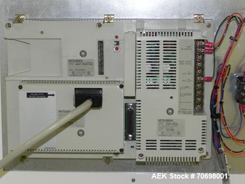Used PFM Model Sierra Horizontal Flow Wrapper. 2 Up 9" wide end seal (vertical lines) configuration for machine speeds up to 150 plus packages per minute. 18' Long infeed with flat blade product lugs currently set up on 8" centers. Has a package size range: length 2" to 18", width 1/2" to 9", height up to 2-3/4". Has film registration. Roll dimensions: width up to 21", diameter up to 11", set on a 3" diameter core. Last used in feminine personal care products. Mitsubishi FX32MR PLC & HMI. 1/60/220V. 16 A .