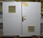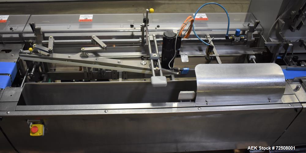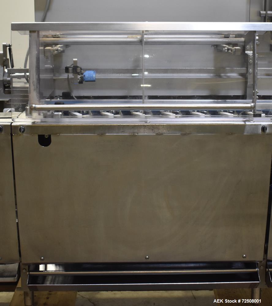 Used Sig (Syntegon/Bosch) Model HSM High Speed Horizontal Wrapper. Capable of speeds up to 1200 packages per minute. Size range: package cutoff length: 50 - 500mm (2-20"), product width: maximum 185mm (13.2"), product height: maximum 80mm (5.12"). Currently set up to run cold seal film. Has film registration, servo belt infeed system, dual web arbors with splice table. Last running enrobed and non enrobed granola bars. Has automatic bar orientor (turner) on infeed to line bars up into single file. Two up seal jaw configuration. Allen Bradley Micrologix 1000 PLC, A/B Logix 5555, HMI. Two like systems available with servo laner for orienting bars. Ideal for protein bars, energy bard, candy bars. 3/60/480 Volt.