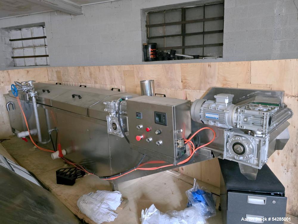Unused Zhucheng Jiayu BST-5000 Pasteurization Line | Steam-Heated | 800 mm Belt | Continuous Food Processing. 304 Stainless steel construction. Steam heated. 800mm (approx. 31.5") belt width. 10-60 minute/circle transfer speed. 51mm (approx. 2") steam inlet diameter. 72mm (approx. 2.8") drain outlet. 51mm (approx. 2") overflow outlet. 1.5 kW (approx. 2 HP), 60/208V. Adjustable support feet. Built 2019.