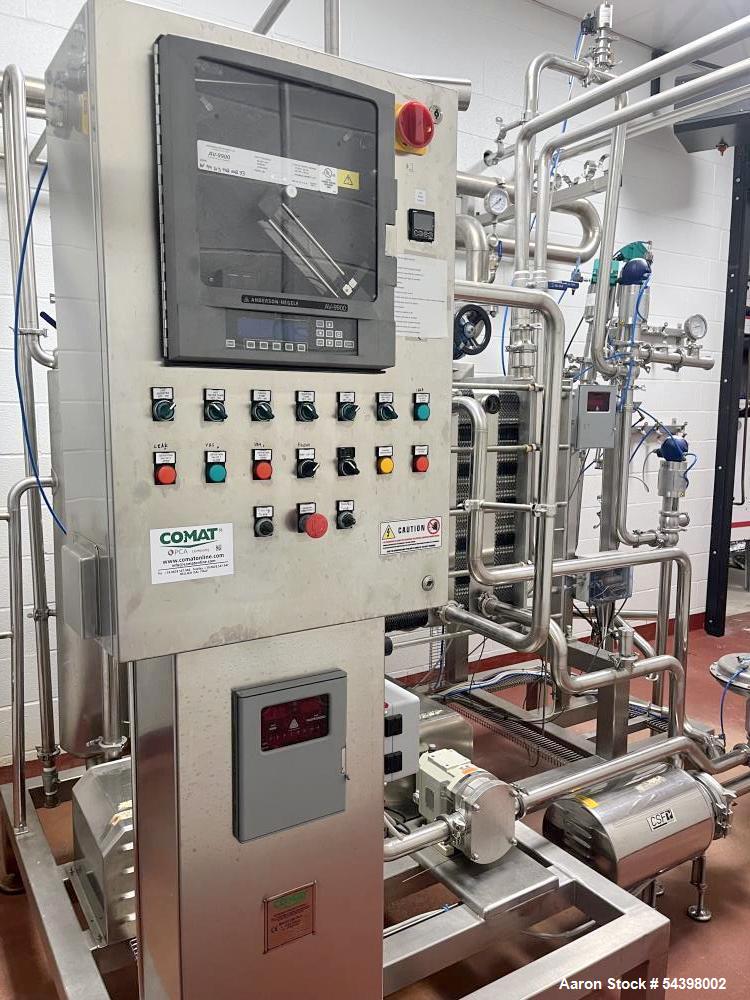 Used COMAT Pasteurizer, Model PS150.35.2. Rated 15,000 liters/hour (approx. 3,300 gallon/hour). Approx. 4 HP. 3/50/480V. Built 2018. Serial# 002761. Previously used for cheese.