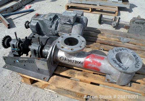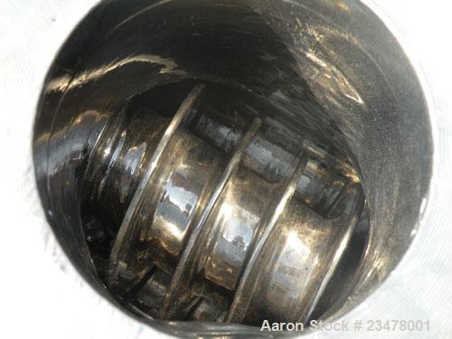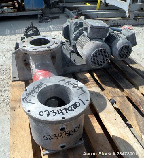 Used Werner & Pfleiderer ZSK120 Twin Screw Extruder Dosing Feeder, 304 Stainless Steel. Approximately 18'' long screw. 4-1/4'' inlet, 5'' outlet. Driven by a 1.35 kw, 3/50/500 volt, gear motor. Requires chain and guard.