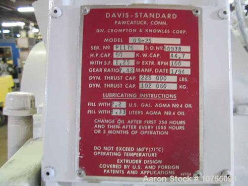 Used Davis Standard 2.5" Extruder, Model DS25, 32:1 L/D. 50 hp, 500 volt, 1750/2100 rpm DC motor into a 60 hp capacity 7.42:1 gearbox with a service factor of 1 at 100 rpm, four zone electrically heated and water cooled vented barrel with a centerline of 70", mounted on a unitized base with casters. Includes Beringer 2.5" side plate screen changer. Manufactured 1/94. Controls and drive panel not included.