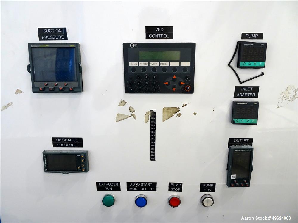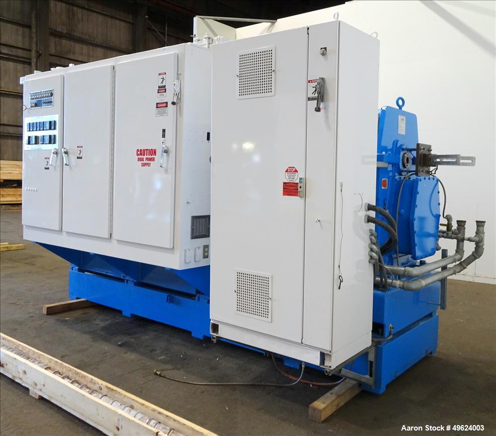 Used HPM 4.5" Single Screw Extruder, Model 4.5-TM-III-30:1, 30:1 L/D, 5 Zones Electrically Heated, Water Cooled, Vented Barrel, Baldor Electric 250 HP Motor, 1175 RPM, Eurotherm Temperature Controllers, Quick Change HPM Gearbox Size 4.5 input RPM 1150-2000, Screw RPM 99-171. Serial # 91561. Includes Controls.