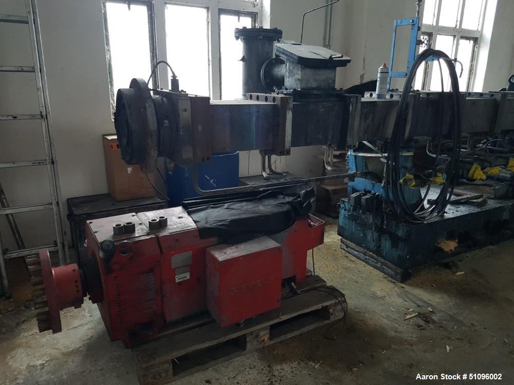 Used Coperion Werner & Pfleiderer Continua 90 Twin Screw Extruder. Screw diameters 2 x 3.5" (90 mm). 26:1 L/D. (5) Barrel section oil heated. (1) Degassing zone. Screw speed 300 RPM via a gearbox by a 165 HP (110 KW) motor. Complete with double screen changer, stainless steel water-bath, guillotine, hydraulic unit, oil heater, vacuum pump, control panel and additional infrastructure. Previous used in a Butyl sealant application. Weight approx. 6 tonnes.