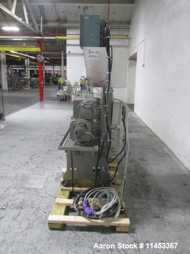 Used Leistritz Twin Screw Pelletizing Line, Model Micro27-GGC-40D. 27 mm screws, counter rotating screws, 40:1 l/d, 500 rpm screw speed. Electrically heated, water cooled barrel, 12 kw, 460 volt dc motor with SCR controller. (10) barrel sections with (1) jacketed feed, (1) vented, (3) vented and plugged, (4) non vented barrel sections. On board control panel with (13) Eurotherm controllers, 10" wide x 180" long cooling conveyor. Beta Lasermike, Model 182. Built 1996. Randcastle strand pelletizer, Model RCP-4.0, 4" wide helical rotor, pull rolls, built 1999.