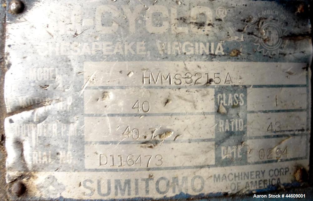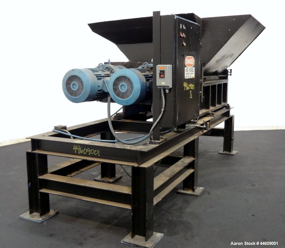 Used Shred-Pax Twin Shaft Shredder, Model AZ-80 EP, Carbon Steel. (2) Rows of intermeshing hook knives approximately 1-3/4" thick. 34" x 52" Feed opening with a hopper, bottom discharge. Each shaft driven by a 40 hp, 3/60/230/460 volt, 1750 rpm motor thru a SM-Cyclo reducer, ratio 43 to 1. Mounted on a frame. Includes a control panel and a 32" wide inclined discharge belt conveyor.