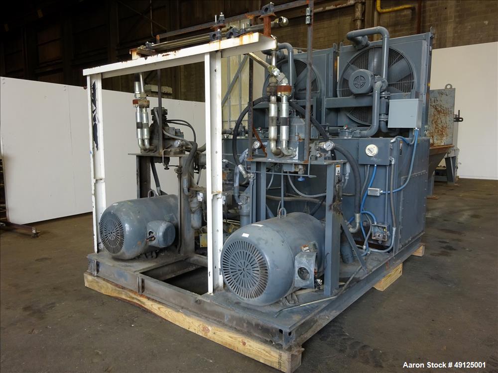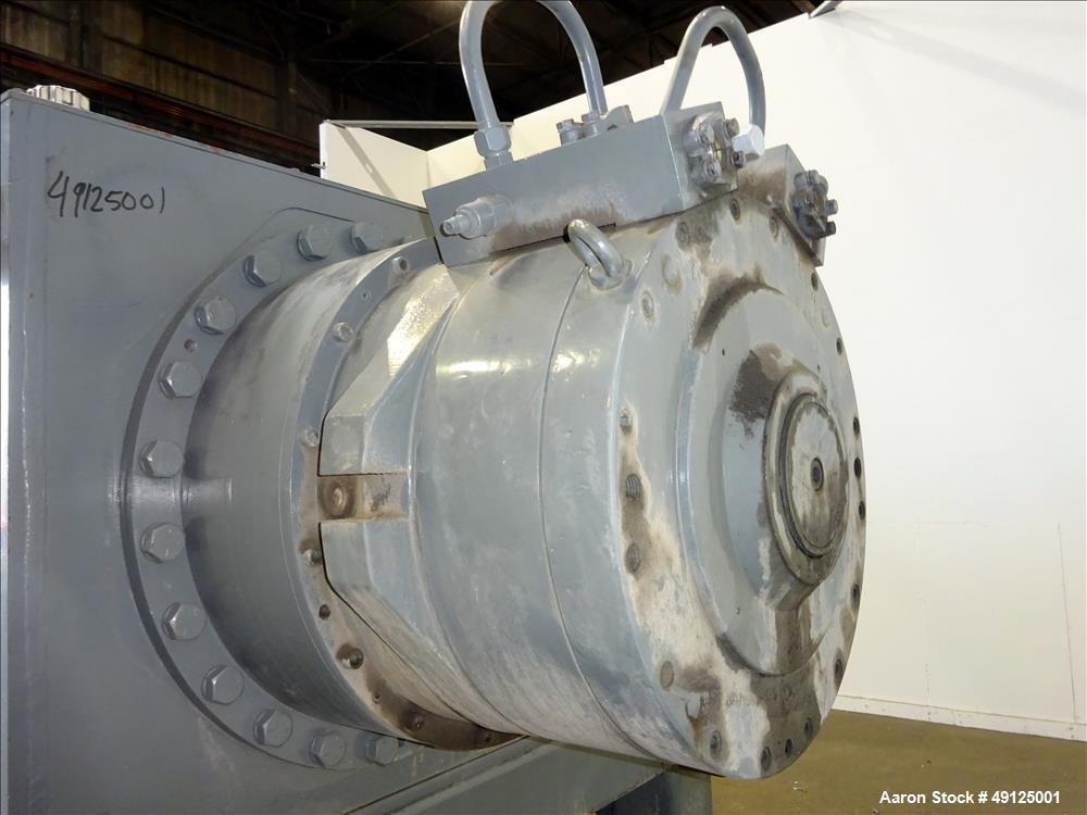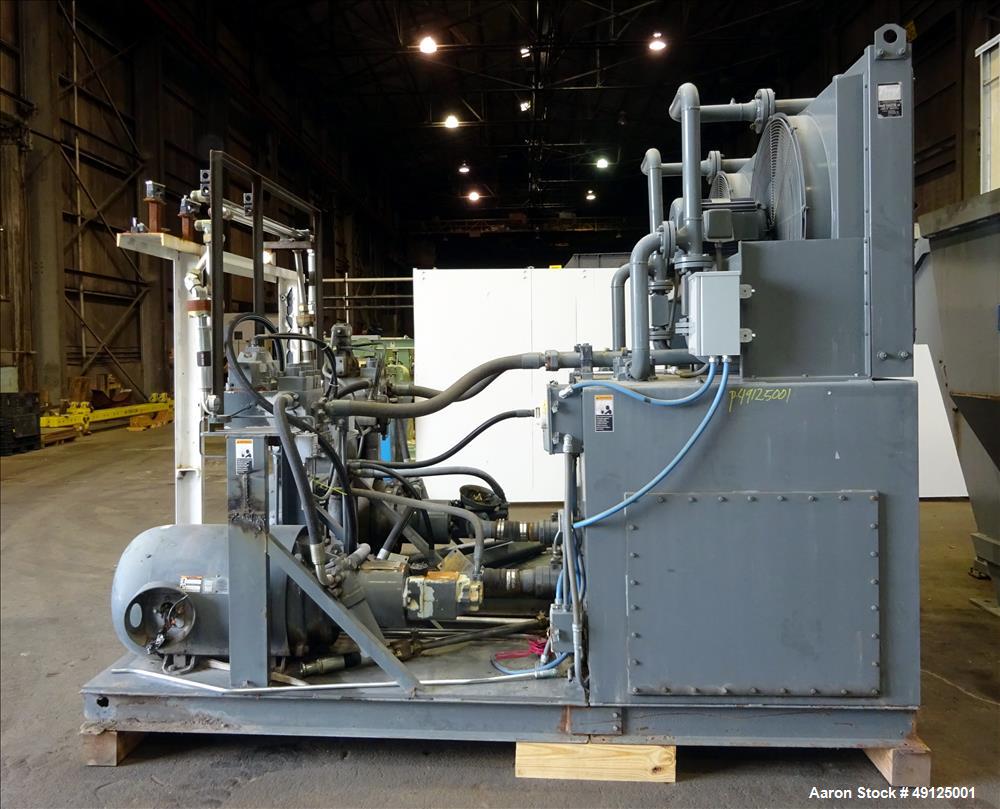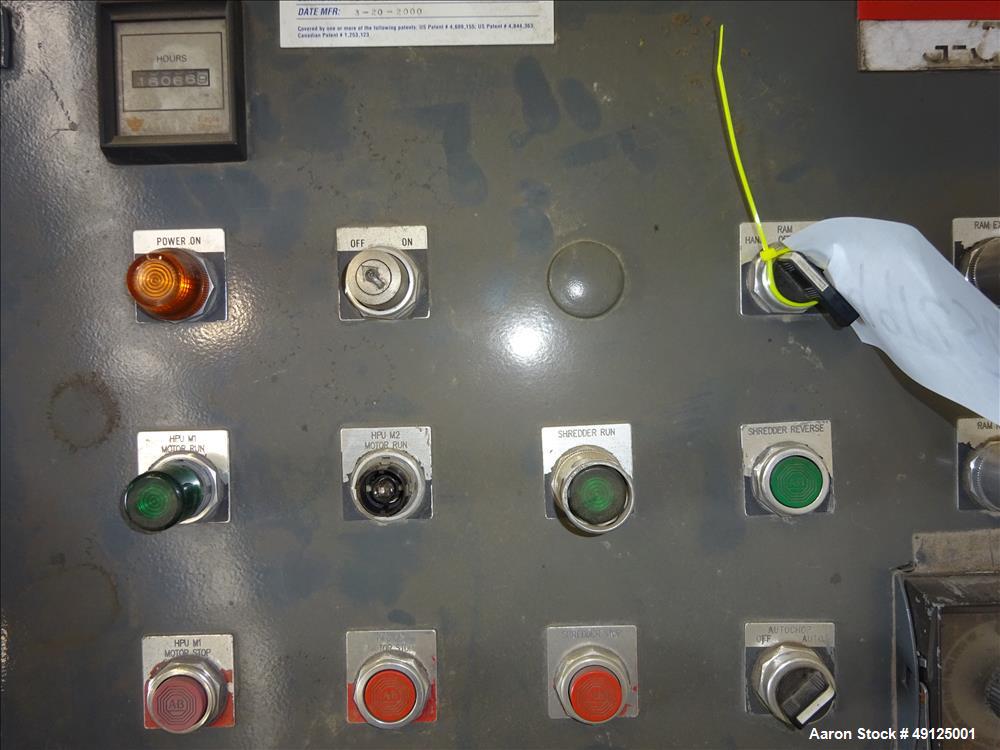 Used SSI Shredding Systems Inc. Dual-Shear Shredder, Series 50, Model 3800-H, Carbon Steel. Approximate 75" x 52" cutting chamber. (2) Approximate 9" diameter shafts with (40) cutters, cutter diameter 27.1", cutter thickness 2". Hydraulically driven by (2) 200 HP, 3/60/460 volt, 1780 rpm motors. Includes hopper with hydraulically driven ram. (2) Control panels (1) with Allen- Bradley SLC 150 drive. Discharge approximate 52" wide x 84" long, no bottom screen. Mounted on an approximate 36" tall carbon steel stand. Serial# 92-147-0627.