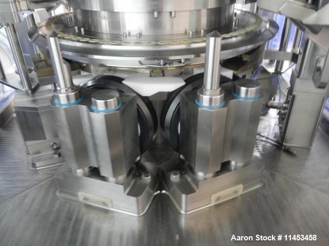 Used Fette 3090i WiP Rotary Tablet Press With Containment. 75 station segmented turret, 100 Kn pre-compression, 100 Kn main compression pressure, 11, 18, 25 mm max tablet diameter depending on segment spacing, 22 mm max depth of fill, keyed upper and lower punch guides, double sided with force feeders, rated 528,000 -1,080,000 tablets/hour production speeds depending on tablet diameter, 3 phase, 50-60 hertz, 400 volt, mounted in WIP(Wash In Place) containment isolator, with Two (2) Pharmatech Combi 1000i WIP units with deduster and Lock MET30+ metal detectors, 230 volt, mounted in WIP(Wash In Place) containment isolators, with, Fette Checkmaster 4 tablet testing unit, type CM4.1, 100-240 volt. Serial # 02100105. Operator interface, WIP (Wash In Place) control skid and control panel. Pharmatech Serial #s 0504751, 0504752. Lock Serial # 25359-1, 25358-1. Fette Serial # 280053. System built in 2005.