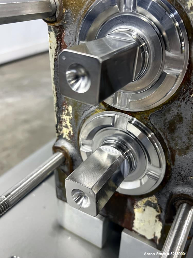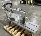 Used APV Crepaco Positive Displacement Pump, Model R3BS. Rated at 36 Gallon Per Minute, 600rpm max speed. (2) 1-1/2" diameter inlet, (2) 2" diameter outlet. Driven by a 5hp, 3/60/230/460 volt, 1725rpm motor through a reducer 28:1 ratio. Mounted on a cart with casters. Serial# C478832-0804.