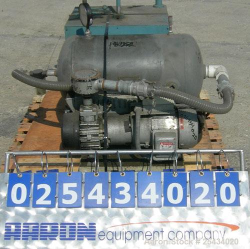 Used Busch Single Stage, Oil Sealed, Rotary Vane Vacuum Pump, Model RC0025-E50G-1101, Carbon Steel.Rated 20 cfm, 15 torr, air cooled.Driven by a 15 hp, 3/60/208-230/460 volt, 1730 rpm motor.Includes a tank.Base mounted with casters.