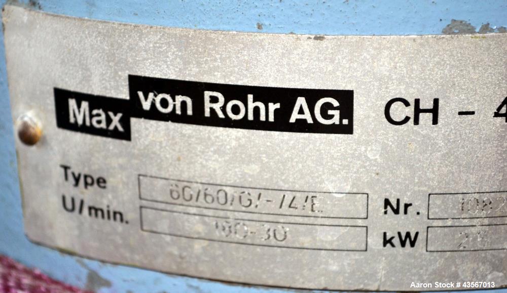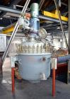 Used De Dietrich Glass Lined Reactor, 700 Liter (184.97 Gallon), 3008 Blue Glass, Vertical. Approximately 38" diameter x 32" straight side. Dished clamp on top, dished bottom. Internal rated -1/6 bar ( -14.5/87 psi) at –25 to 200 degrees C (-13 to 392 F). Carbon steel jacket rated -1/7 bar (-14.5/101.5 psi) at –25 to 200 degrees C (-13 to 392 F). Max Von Rohr AG agitator, type 60/60/G/-/4/E, rpm approximate 180-30. 2 Finger up baffle, 3 blade RCI, driven by a 2.5kw (3.25 hp), 3/50/500 volt, 1440 rpm variable speed motor. Openings top (4) 3’’, 6’’, 10’’ hand hole with a 3’’ sight glass in the cover. 4’’ Bottom outlet. Mounted on lugs and legs.