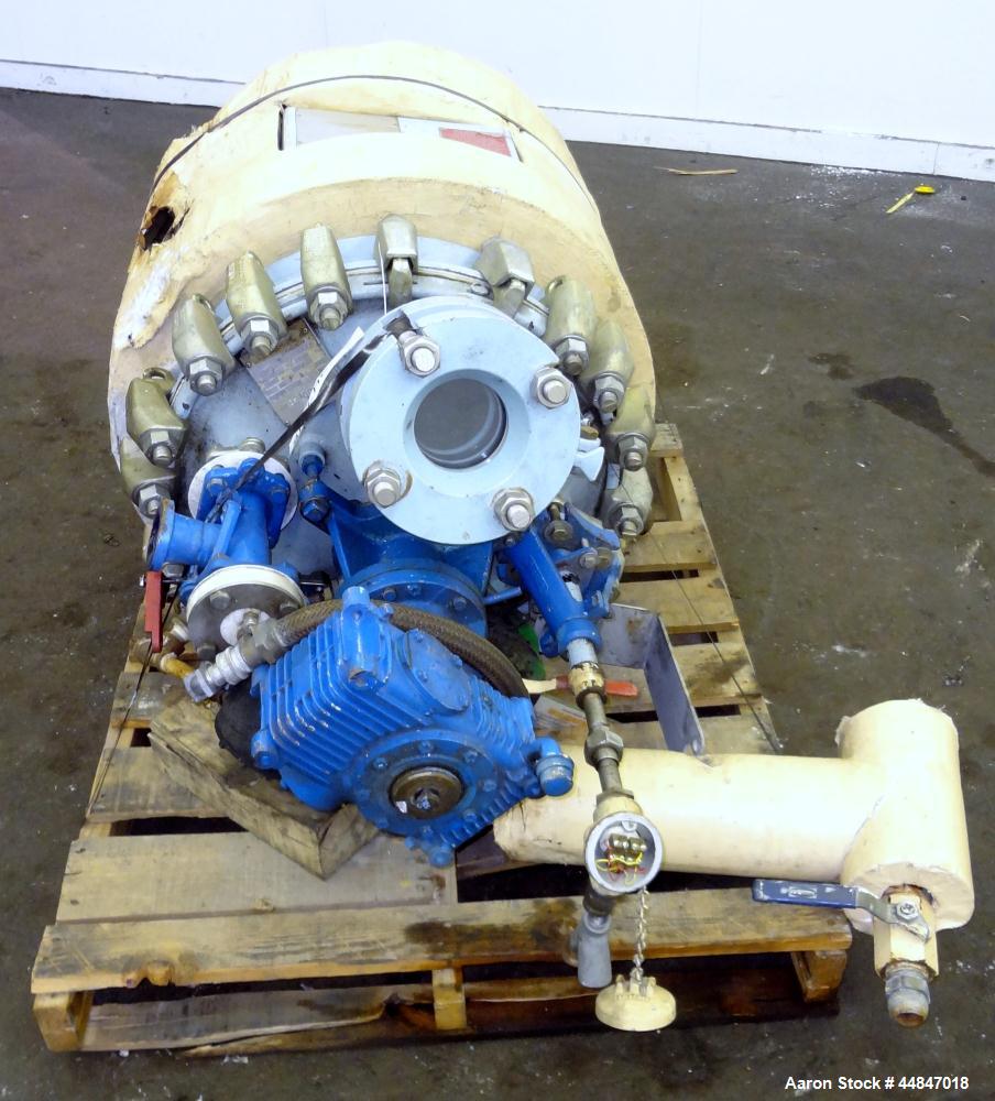 Used Pfaudler Clamp Top Glass Lined Reactor, 20 Gallon, 9115 Blue Glass, Vertical. Approximately 20" diameter x 14-1/2" straight side, dished clamp top, dish bottom. Internal rated 150/full vacuum psi at -20 to 450 degrees F, carbon steel jacket rated 125 psi at -20 to 450 degrees F. (1) Fin baffle, 3 blade retreat curve agitator driven by a Pfaudler drive, size 2.5 TWV, model SV-48270C-AKC, serial # 24981X. Ratio 5 to 1, set up for hydraulic drive, connection for drive broken off and missing, no power pack. Openings: top (2) 1-1/2", (2) 2", 4" hand hole with sight glass cover; 2" center bottom outlet. Provision for 3 legs. National Board # 51396, serial # J062355. Built 2005.