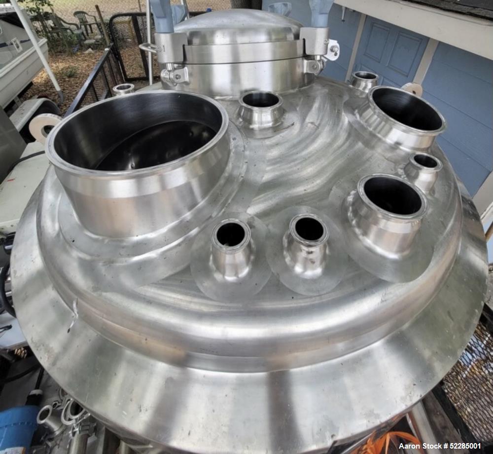 Used DCI Reactor, 120 Gallon / 454 Liter Capacity, 316L Stainless Steel, Vertical. Approximate 37" diameter x 26" straight side. Dished top, coned bottom. Internal rated 50 psi / FV at -20 to 350 degrees F. 304 Stainless steel dimple jacket rated 135 psi / FV at -20 to 358 degrees F. Openings top: 16" manway with cover, 10", (3) 3", (3) 1.5". 2" Center bottom outlet. Mounted on 4 legs with casters. National Board# 6320, Serial# JS3343.