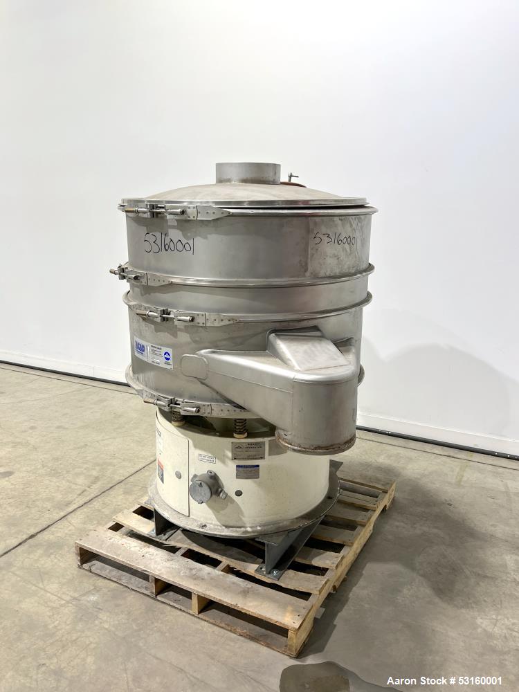 Used Sweco Screener, 40" Diameter, Model XS40S1248P4SFTLW6, 304 Stainless Steel, Double deck (3 separations).Openings top 9-3/4", 6" diameter, 8" side top outlet, 10" side bottom outlet. Top screen approximate 1-1/4" x 1-1/4" holes, bottom screen approximately 1/4" x 1/4" holes. Driven by a 2.5hp 3/60/460v 1160rpm motor. Mounted on a carbon steel base. Serial# 944275-A04/10.