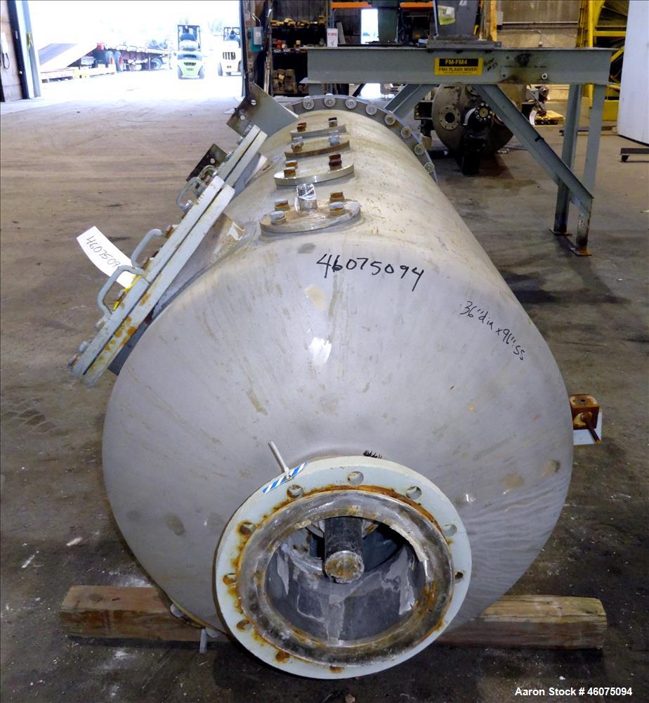 Used Agitated Tank, 425 Gallon, 304 Stainless Steel, Vertical. Approximate 36" diameter x 96" straight side. Dished top and bottom. Top entering Lightnin agitator, model 82-QS-5, serial# 8524759201, approximate 2-1/2" diameter x 154" long shaft with 3-tier, (4) blade mixing disc, bottom supported. Driven by a 5hp, 3/60/230/460 volt, 1750 rpm motor, 11.5 to 1 ratio. Openings: 6", 6" for agitator, 4" sight glass, 4", 3". Side: (3) 16" man ways with covers, (4) 6", (4) 3", (3) 2", (3) 2" NPT. 10" Center bottom outlet. Side lug mounted.